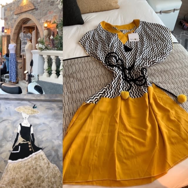 店のファサードが小洒落ていたので入店したところ、ブティック奥に飾ってある非売品のモード絵画に釘付けになった。ディオールを彷彿させるシルエットが印象的な作品はオーナーのボーイフレンドのオリジナルだ。水着の上に被るのもOKなカフタンはプールサイドでのランチにとても似合う。以前、クルーズよりアブダビ経由で帰国の際、訪れた砂漠のリゾート Anantara Qasr al Sarab Desert Resort内のブティックでエキゾチックなカフタンを見つけたものの値段があまりに高く購入を断念したことがある。ここのカフタンは値段も手ごろで実に個性的で一目ぼれし購入した。