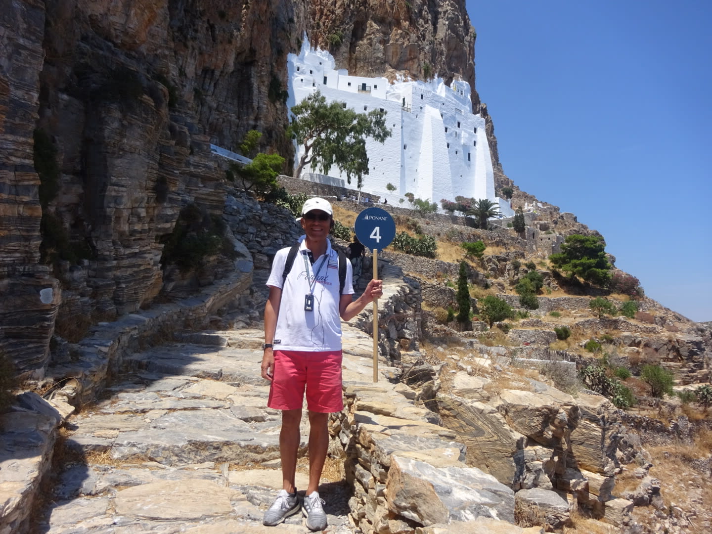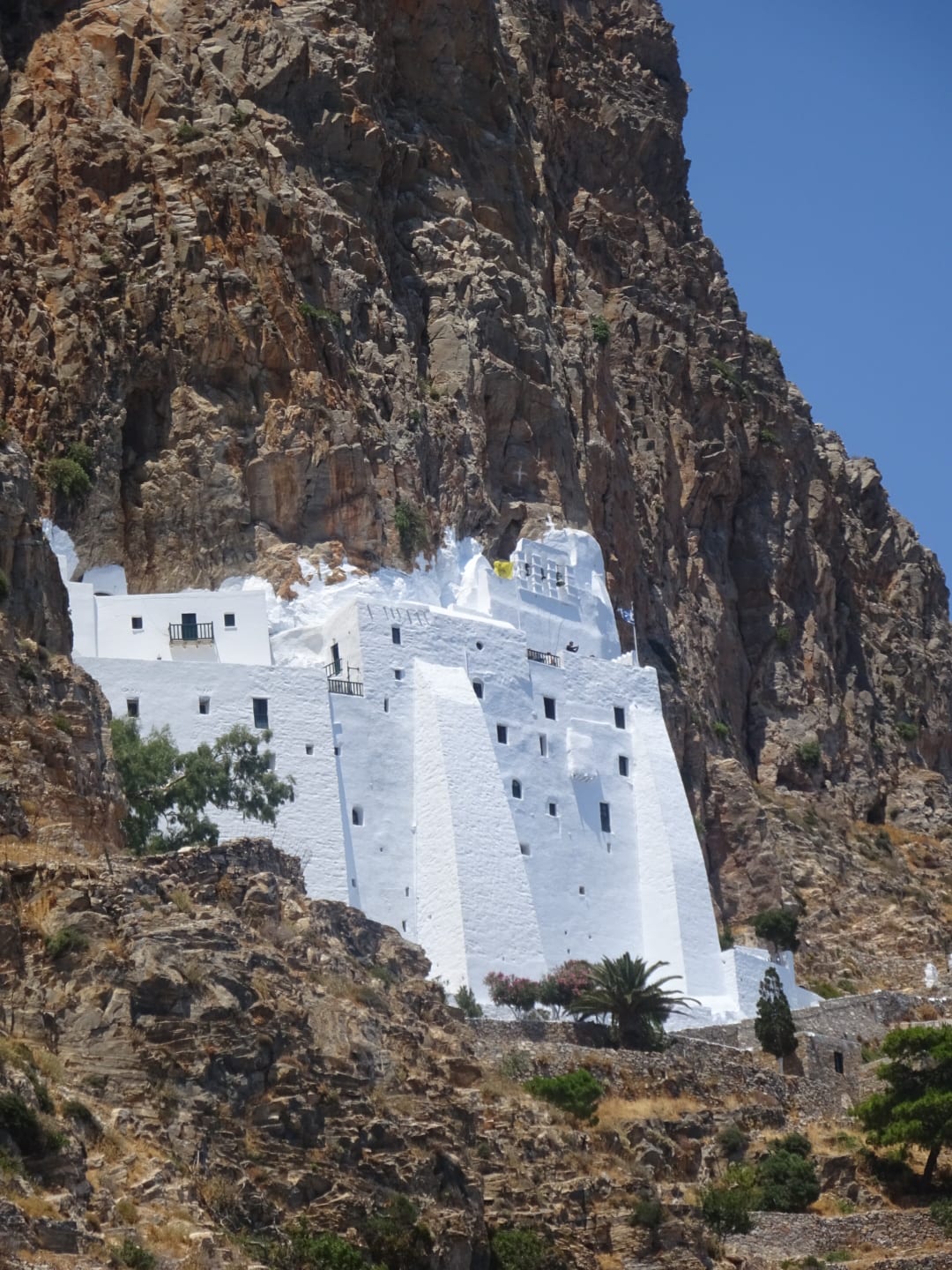 リュック ベッソン監督の映画 グラン・ブルーのロケ地の一つとして知られているアモルゴスに着く直前、船内はThe Big Blue Overtureが静かに流れ、乗客の気分は否が応でも盛り上がる。今か今かとテンダーボート乗降口は人集りとなる。私は前日シアターで開かれていた寄港地レクチャーにも参加し、準備万端、やる気満々だ。