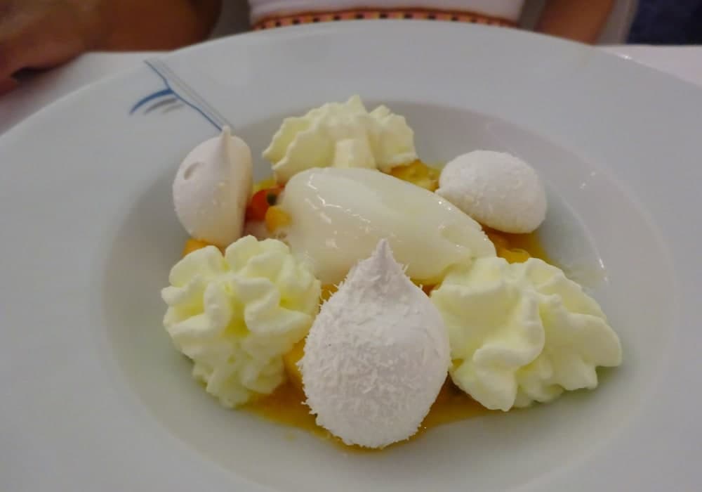毎回いろいろな人と席をシェアし楽しく過ごせました。特にテラスで海風にあたりながらの食事は最高でした。コルシカ島は風が強く、やむなくレストランでの食事になることもありましたが、これはこれでエレガントな空間を味わいました。料理はパティシエ出身者が作っているらしく、まぁまぁ。船が小さいのでやむをえないのかもしれませんが...