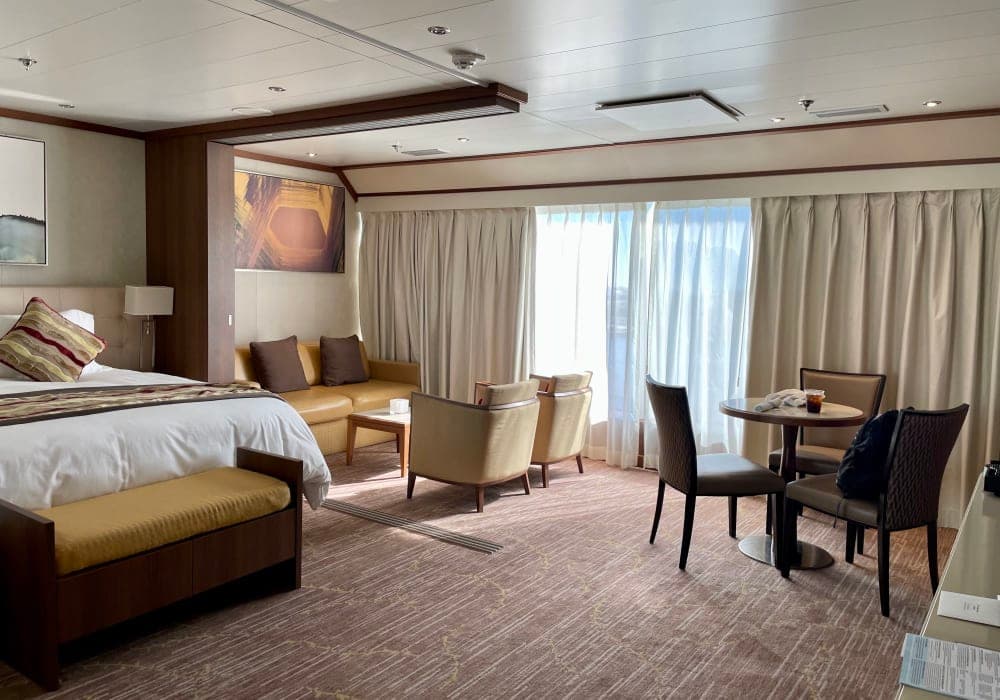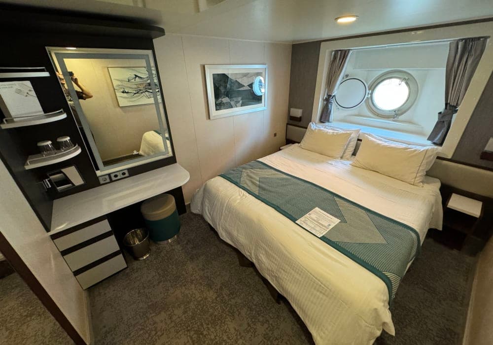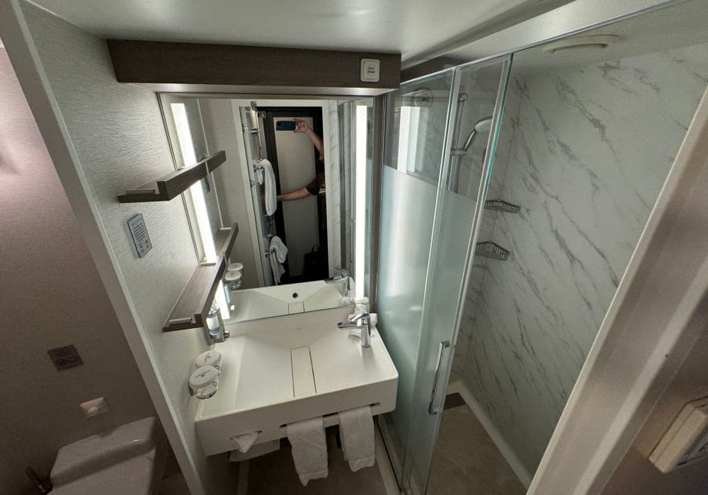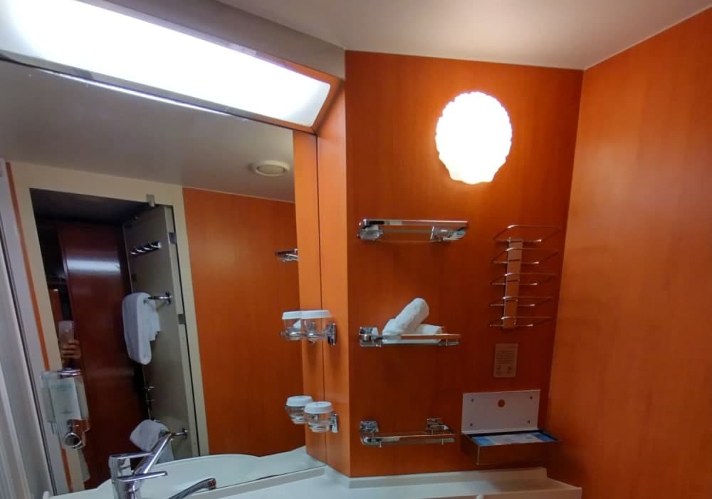 乗船前日に最低価格でのアップグレード入札が通って海側になりとても満足。 シャワーブースが広くトイレの仕切りが別なのも良かった。 収納が多く、コーヒーメーカー風湯沸かし器があり、部屋でお茶やコーヒーが飲めます。