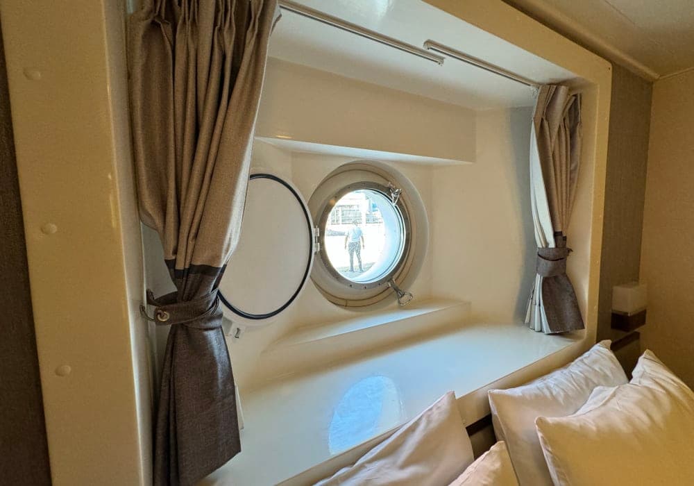 丸窓の部屋でしたが、ギャングウェイに近く、出入りが便利でした。 シャワーブースからの水漏れ(止水のための樹脂製部分が破損?)があった程度で 騒音やトイレなどのトラブルもなく、特に客室にも不満はありませんでした。