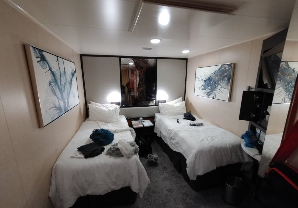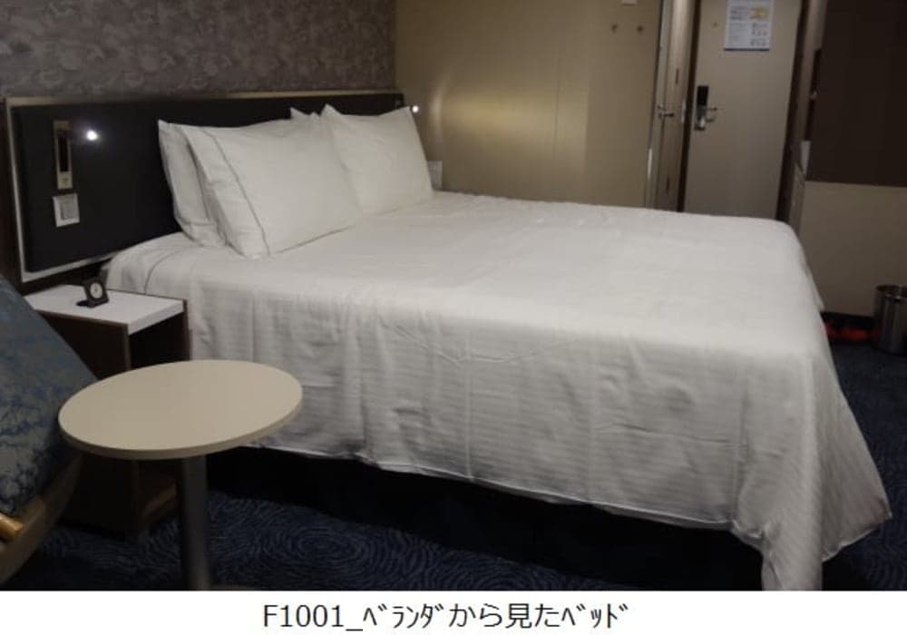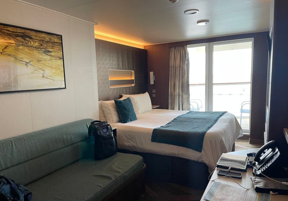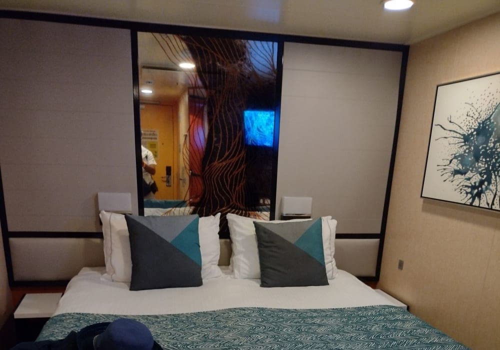 バルコニー客室でした。 両サイドの壁が波型にウエーブしたデザインでしたが、ベッド脇の通路が通りずらくて不便でした😝 さすがに評判が芳しくなかったようでこのタイプの部屋は他の船には無いそうです。
