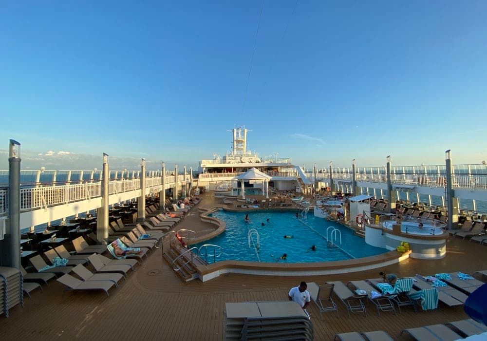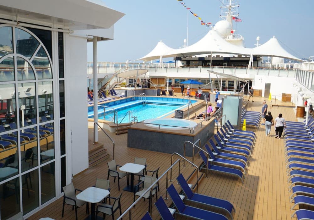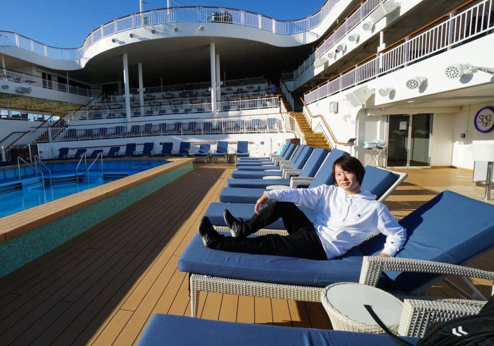 暑かったのでプールにでも入ろうかなと思ったのですが、意外にもプールがとても小さい。あんなに大きな船なのに。他の外国の方は日光浴が主な目的で、あまりプールの範囲を大きくしていない模様。少し残念でした。