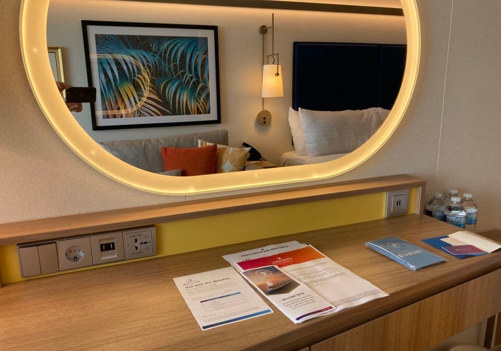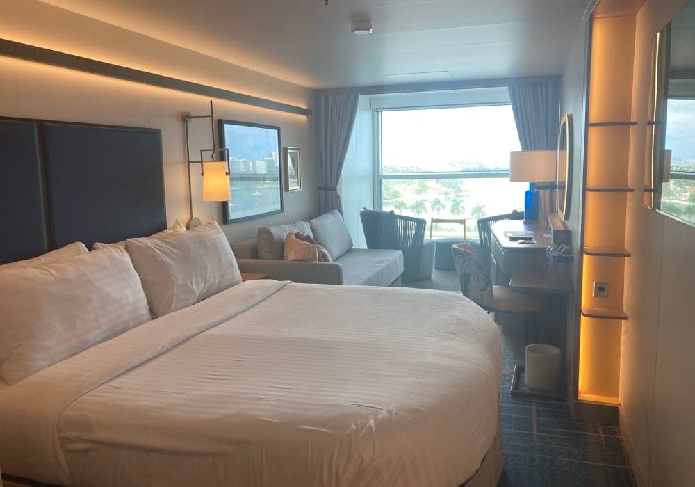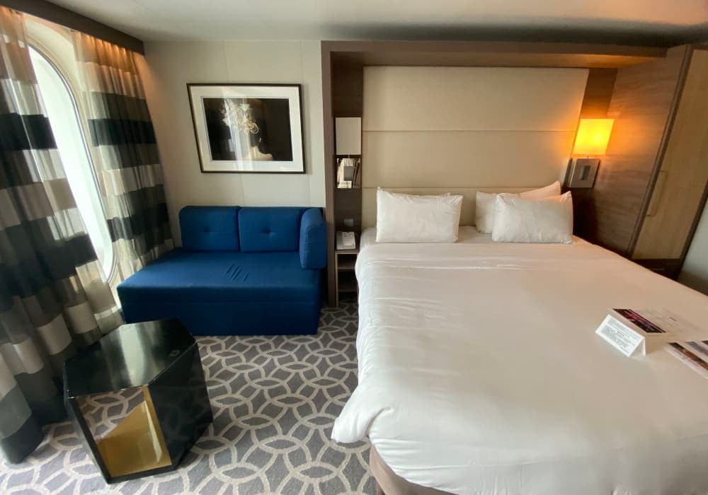 オーシャンビューを予約しましたが、ロイヤルアップという入札でバルコニーになりました。 部屋の広さは問題ありませんが、ベッドがツインにできないと言われ、ソファーをベッドにしてもらいました。 収納場所は、クローゼット(狭い)とベッドの上に棚がありました。 使い勝手は悪かったです。