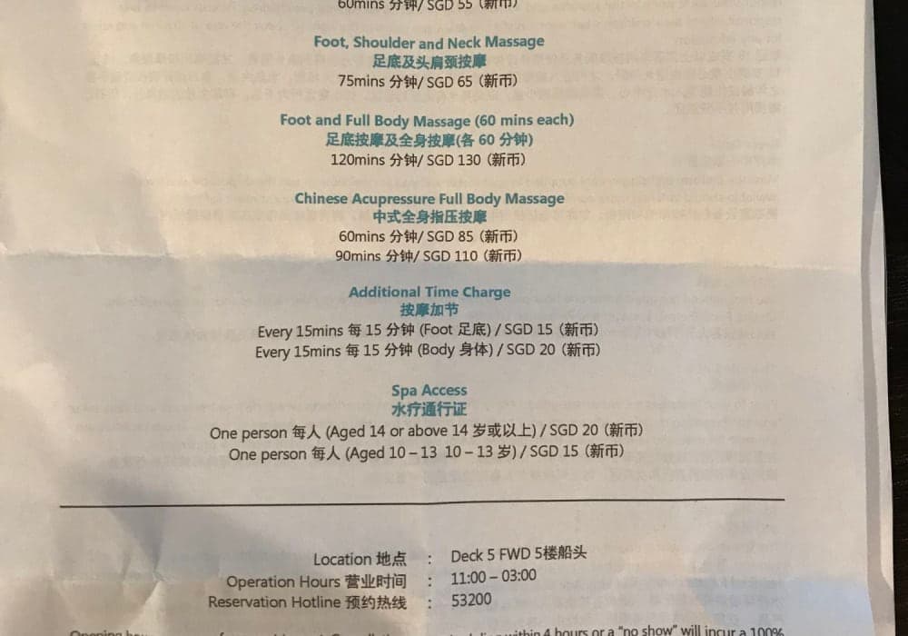 最新設備でどこも居心地がいい。 ショーも見応えがあって、前列シートはスイート用にブロックされているので、ギリギリに行っても最前列で鑑賞できた。(これは乗船客が定員の半分くらいだったためかも知れないですが) スパが2箇所あり、お手頃価格のアジアンスパは夜中の3時までやっていたので何度か利用しました。 深夜は空いてい...