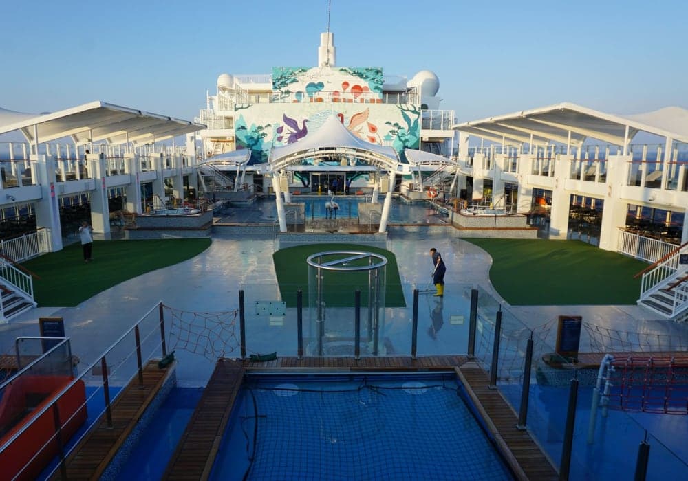 スライダーが5本。すべて挑戦したが、怖くなく楽しいレベル。 プールの水深が浅く1.2メートル。今までの西洋のクルーズ船では2、3メートルだったのでびっくり。 デッキチェアが少ない。アジア人は日焼けを好まないためだと思う。 短いレーンのボーリングがある。料金不明 カジノがとにかくすごくて、カジノに人が集中して、他は...