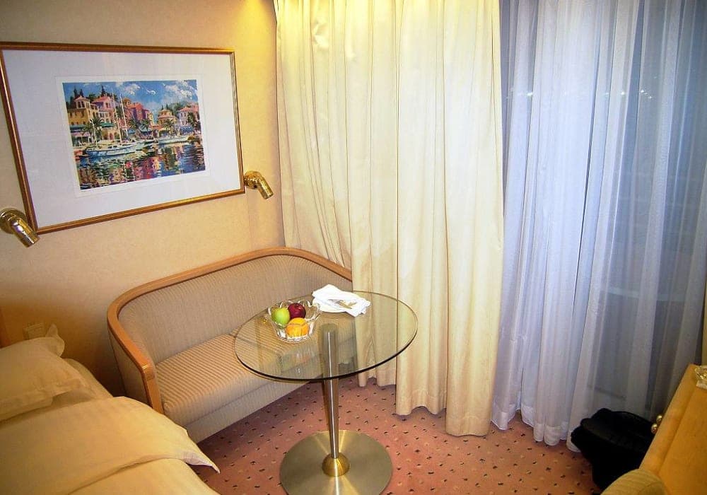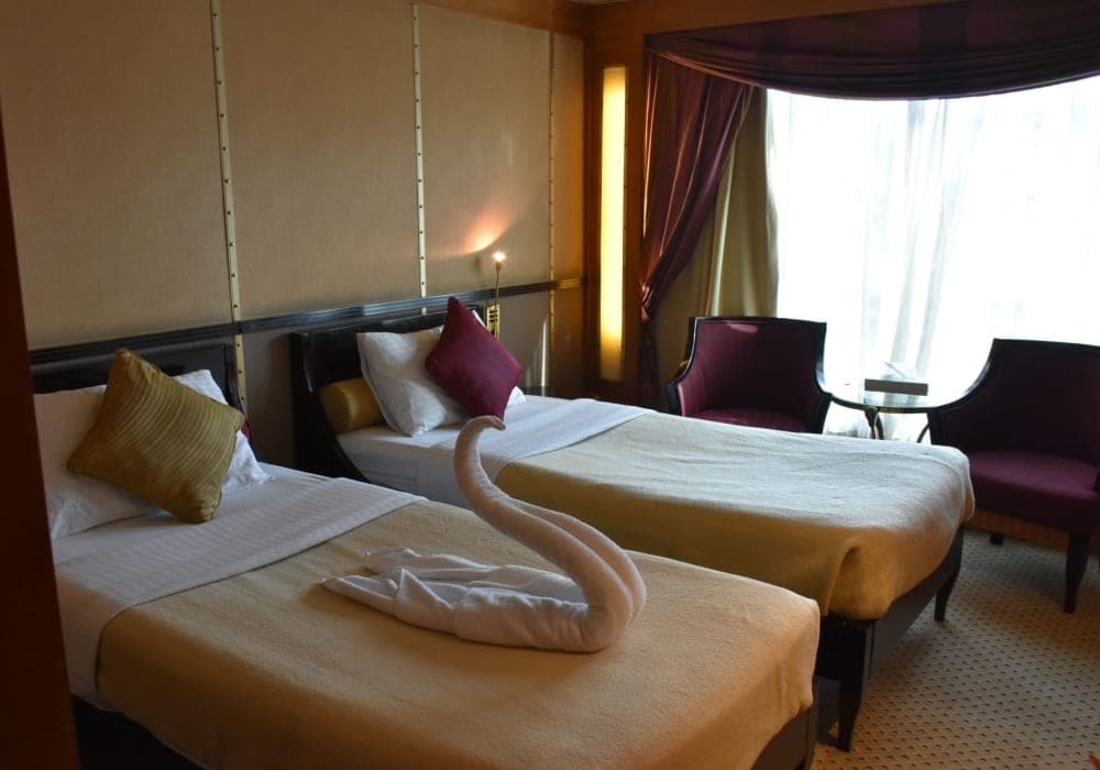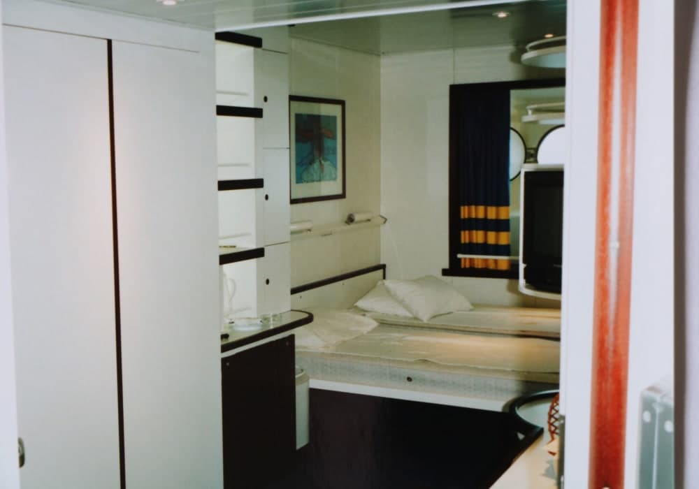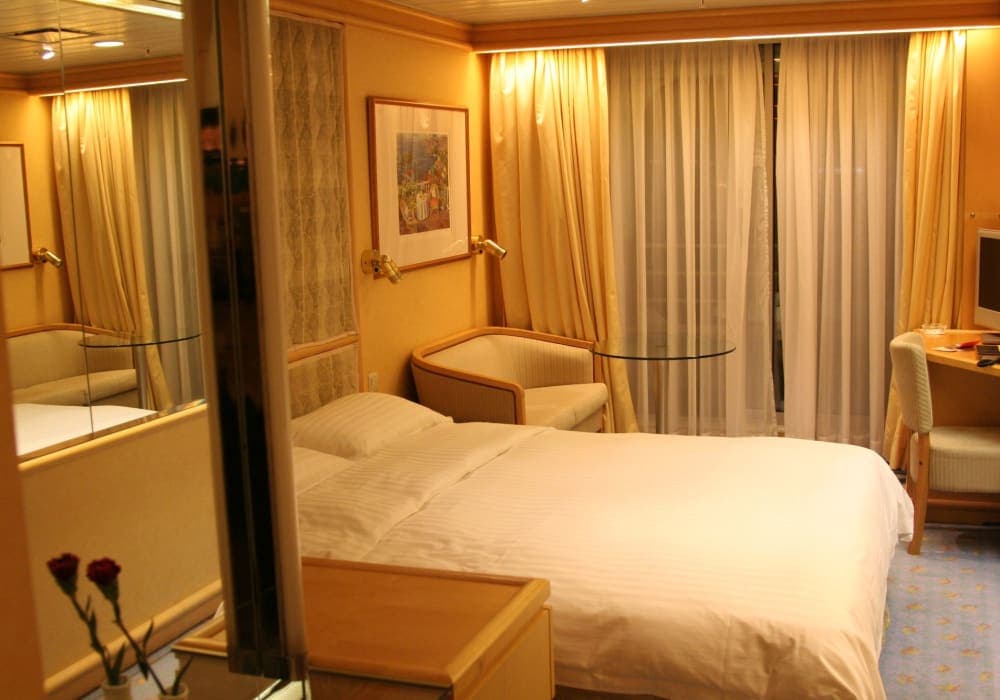売船されてラグジュアリーシップからカジュアルシップになったとは言え、「カジュアルに豪華客船を楽しめる」 と言う謳い文句ですから、キャビンの内装は殆ど変わらないはのでは? と、ちょっと期待して、キャビンに向いました。 キャビンの内装は綺麗な木彫で落ち着きがあり、 長期間のクルーズにも馴染み易いように感じました。 ク...