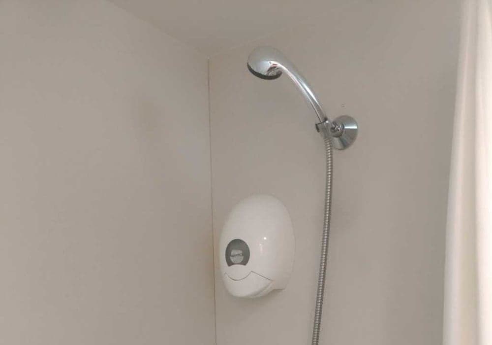 白色を基調とした真っ青な配色のキャビン。シャワーブースも含めて機能的なキャビン。