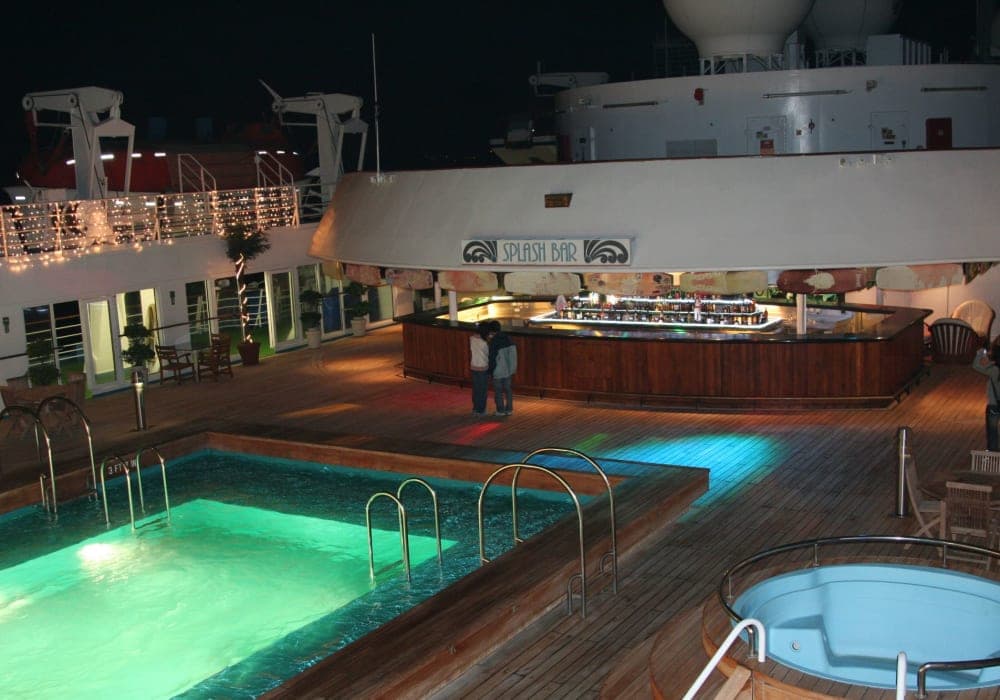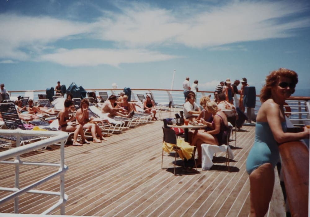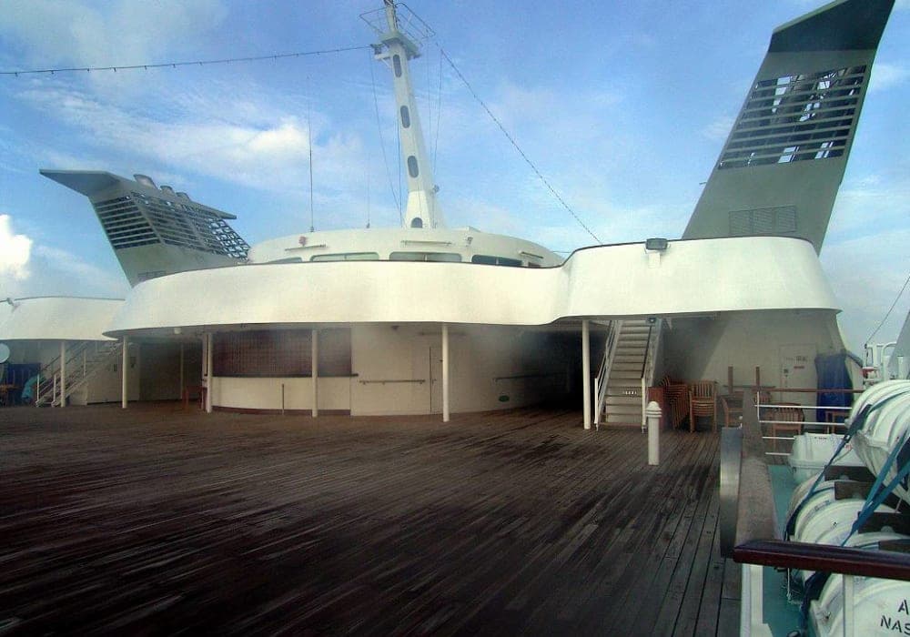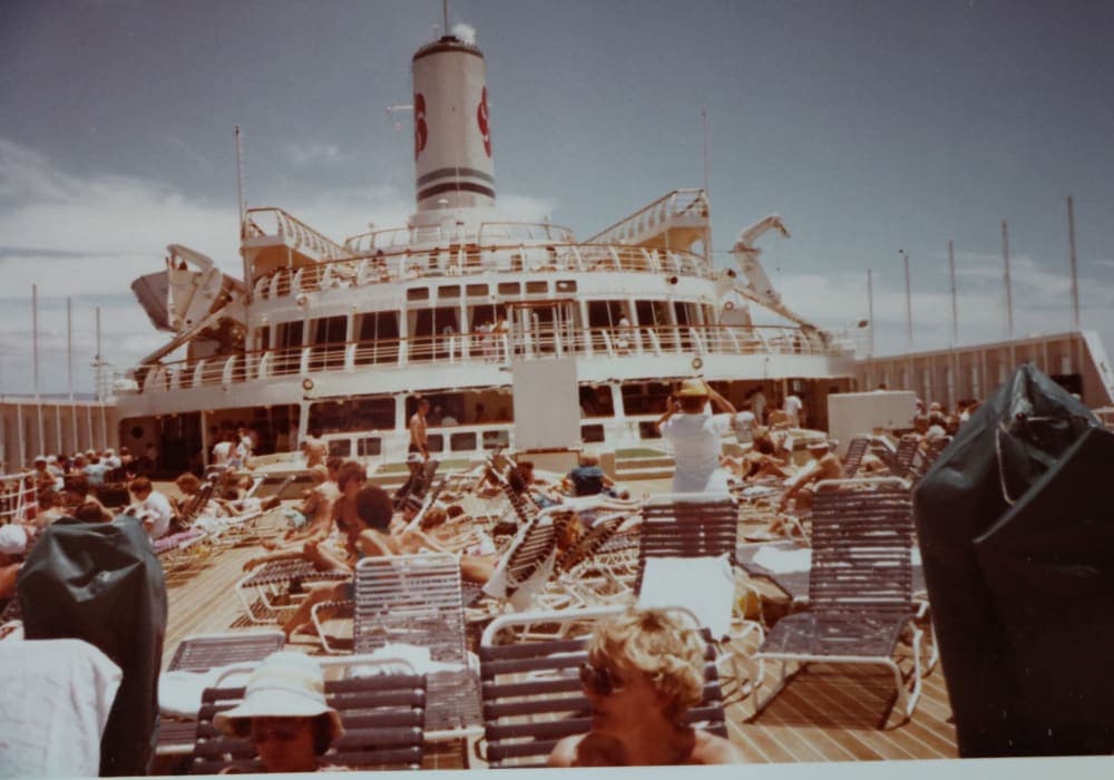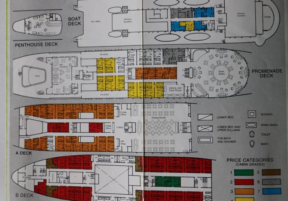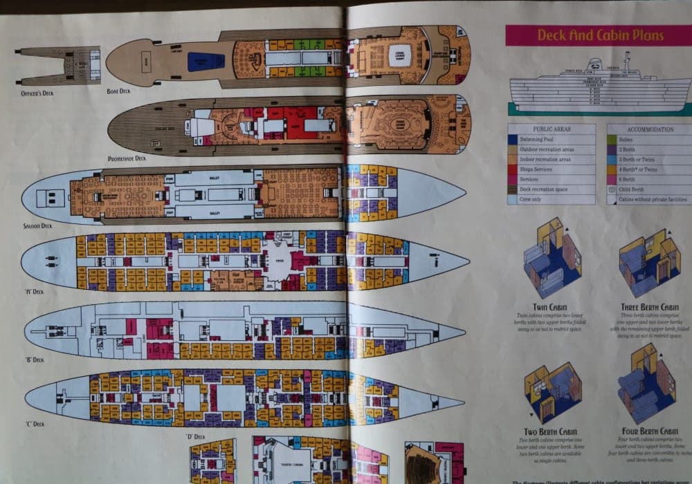 総トン数22,300トンの本船は9つのデッキ(上からスポーツデッキ、ボートデッキ、サンデッキ、プロムナードデッキ、アッパーデッキ、メインデッキ,アロハデッキ,バリデッキ,コーラルデッキ)からなり、3つのバー、会議室、劇場、2つのプール等の設備。大西洋航路を就航していただけにさすがに貫禄がありました。 4つの島を代...