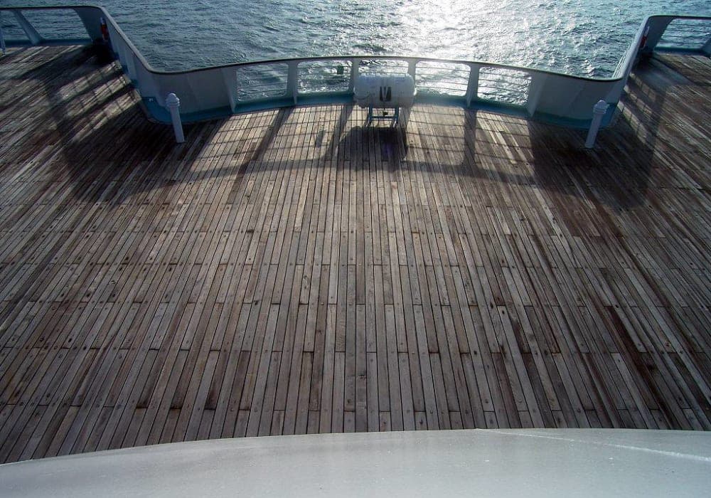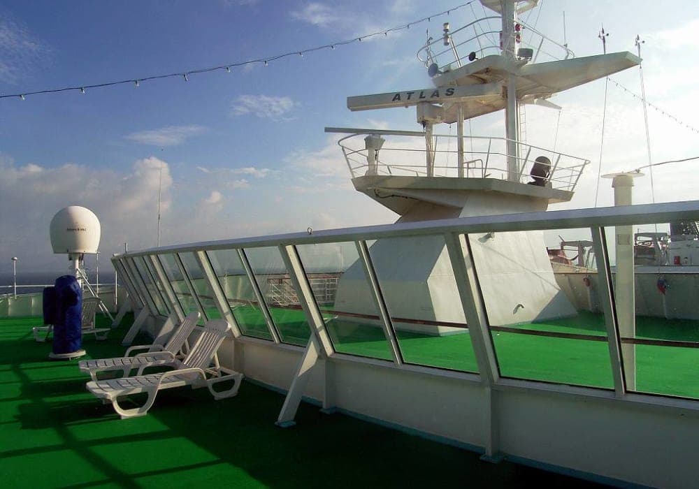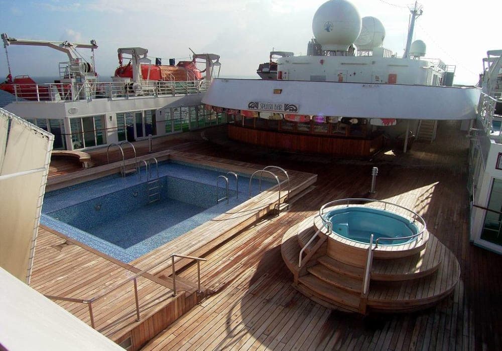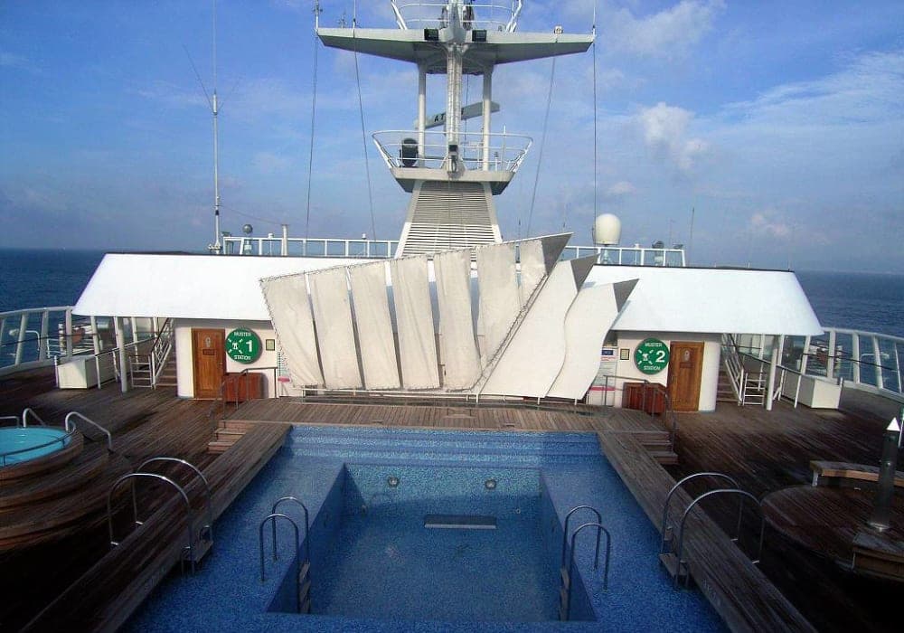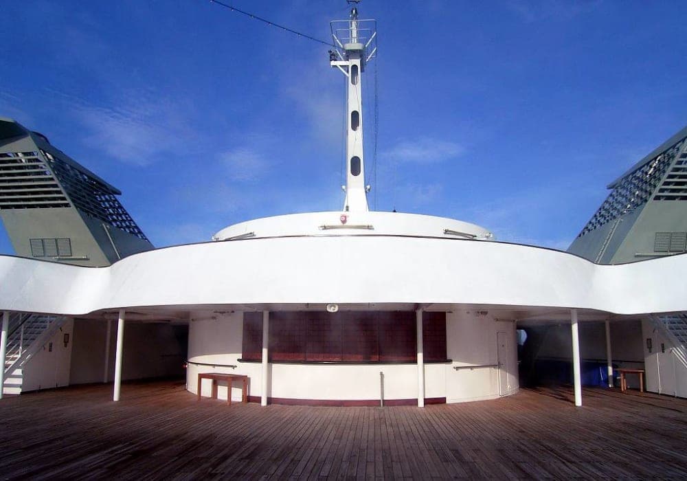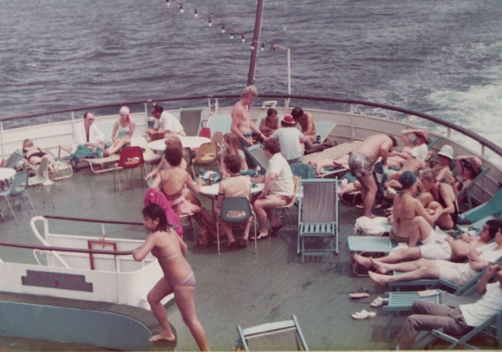総トン数22,300トンの本船は9つのデッキ(上からスポーツデッキ、ボートデッキ、サンデッキ、プロムナードデッキ、アッパーデッキ、メインデッキ,アロハデッキ,バリデッキ,コーラルデッキ)からなり、3つのバー、会議室、劇場、2つのプール等の設備。大西洋航路を就航していただけにさすがに貫禄がありました。 4つの島を代...
