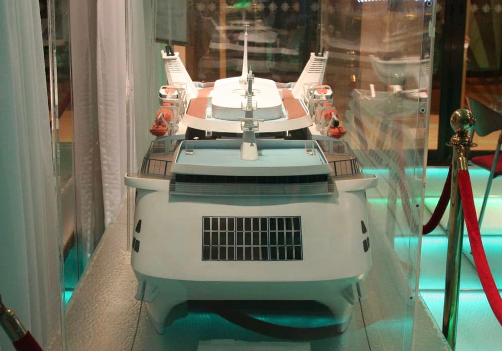RECEPTIONの正面にあるメインエレベーターは、左右2台から成るガラス張りの展望エレベーターで、 その回りを足元が透かしになった螺旋階段が取り巻くように延びています。ちょっとお洒落で、かつてのラグジュアリーシップの面影が残るデザインでした。 双胴船という特徴を利用して、かつては4デッキから船尾の可動式船外プー...