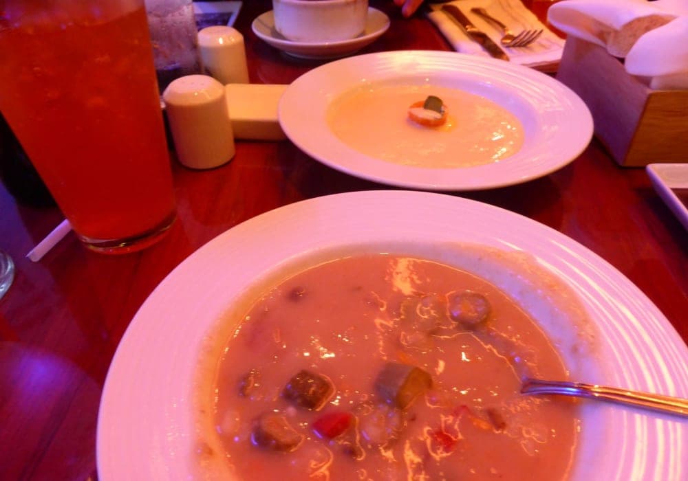 メインレストランでは今回8日間のクルーズ中3回もロブスターが出たのに驚いた(私が今まで乗った他のカジュアル船では有料レストランにしかなかった) また名前は忘れてしまったがベリーズ寄港日にでたピンク色のスープがとても口当たりがよく甘くて美味しかった、カーニバルでのメインレストランでは必ず1品は寄港地の名物メニューが...