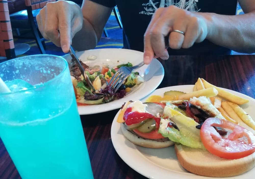 前回はロイヤルカリビアンだったのですが、セレブリティの方が食事は豪華で美味しかったです。 レストランやビュッフェとは別に、デッキにもバーガーやポテトのブースがあり、とてもジューシーで美味しかったです。