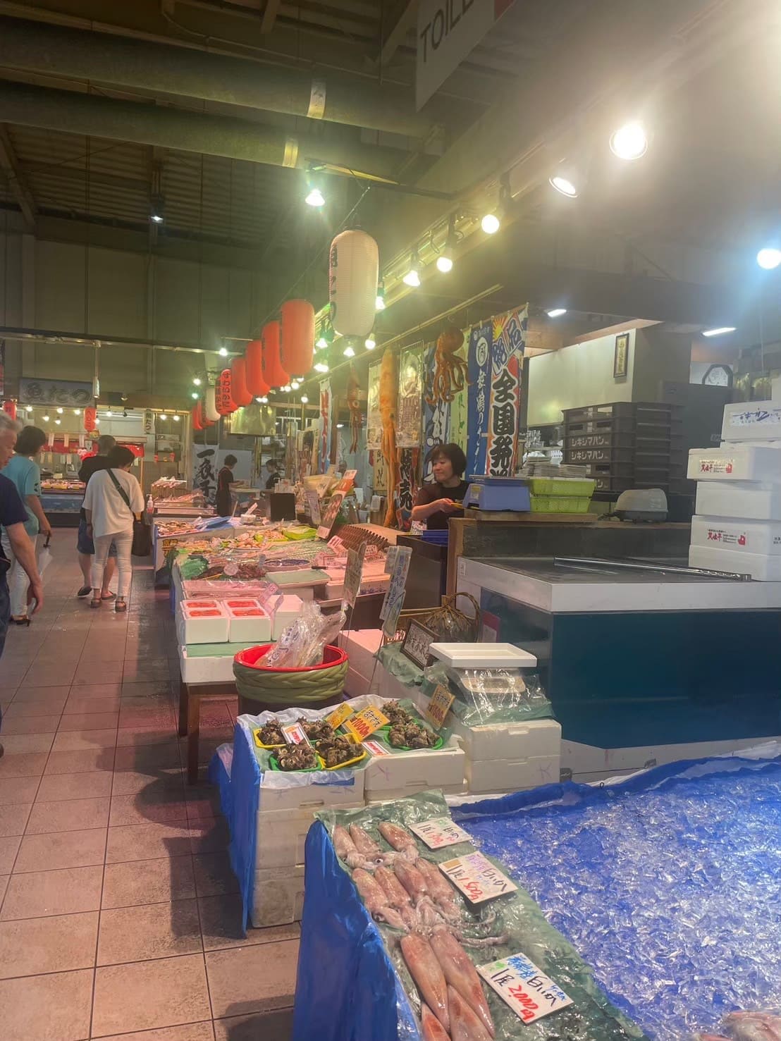 目の前に並べられているお魚・かに・貝・えびなどを、目の前で調理してもらい、その場で海鮮焼き・お刺身としてすぐ食べられるシステムが大好評です。