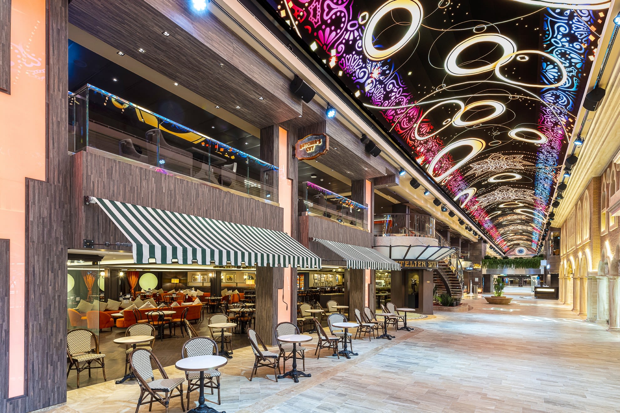 洋上で最も長いLED型ドーム「ギャラリア・ビルトゥオーサ」(Galleria Virtuosa)を備えており、その距離100m以上。船上で最大のショッピングエリアとなりました。ドーム下には各種ブティックやバーなども並び、この船一番の社交場的存在です。