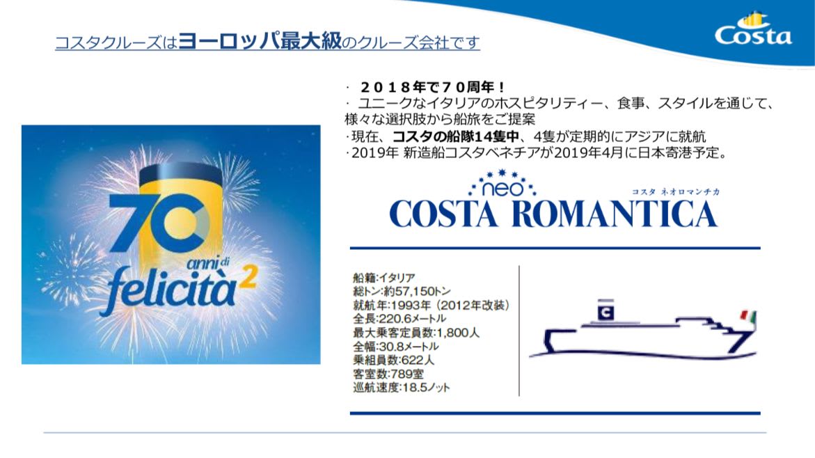 (談:司会)続きまして、近隣の金沢港や舞鶴港から乗船可能なコスタ・ネオロマンチカをご紹介いただきます。