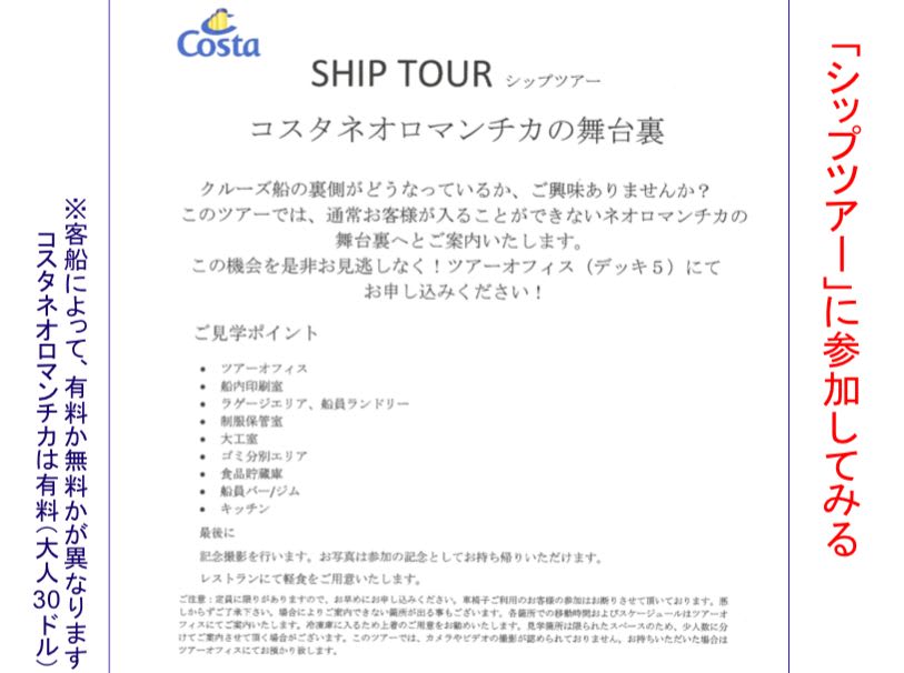 あとパスポートの話なんですけど、確かにコスタさんは外国客船なんでパスポートが必要なんですけど、船乗った瞬間イタリアって感じで楽しめますね。