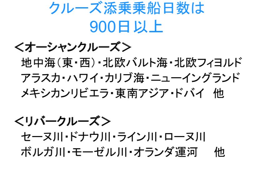 クルーズの専門会社ということで、乗船日数も今ご紹介いただいたように海のクルーズの添乗でバルト海、地中海で730日くらいで、後はリバークルーズで合わせまして約900日くらい。