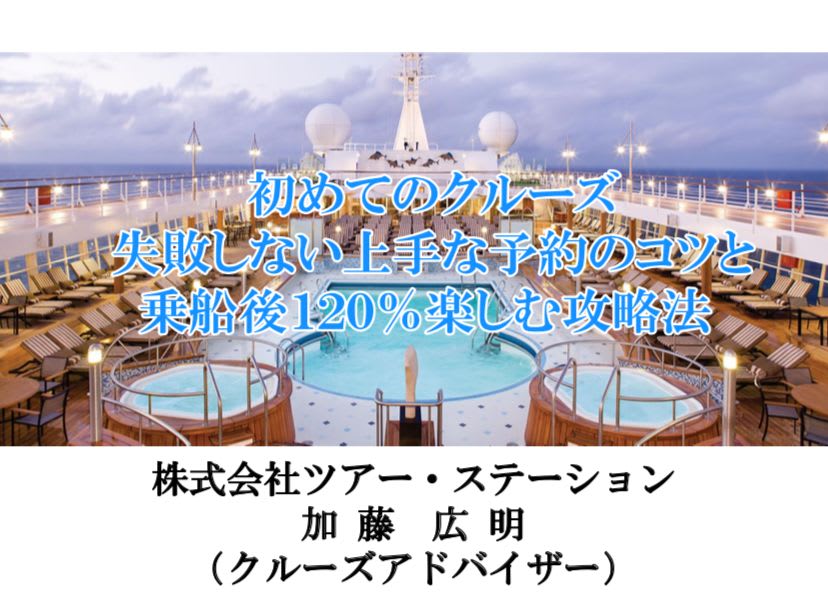 本日は「初めてのクルーズ、失敗しない上手な予約のコツと、乗船して120%楽しむ攻略法」と題しまして講演をしていただきます。