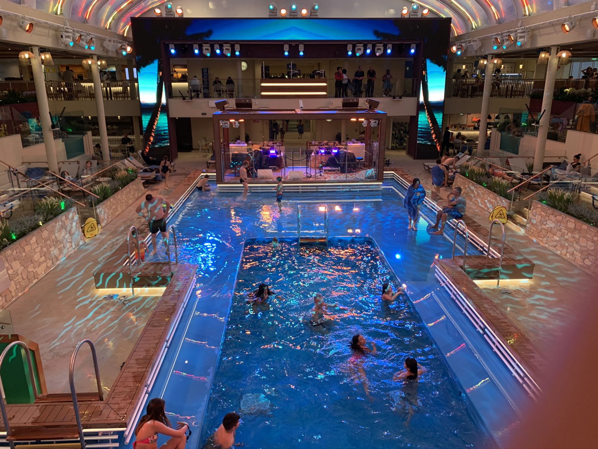 屋外や屋内のプール、そして最新マシーンが取り揃えられたジムを無料で使用できるのはもちろんのこと、船のシアターで毎晩おこなわれるショーやコンサートも無料で楽しむことができます!