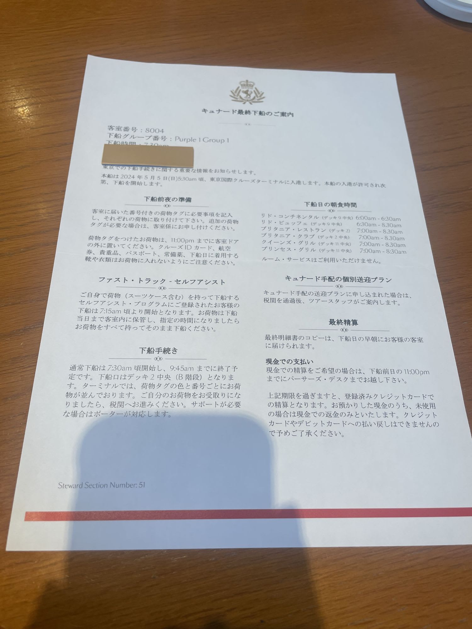 しかし、キュナードでは最終下船の説明のための書類がとっても分かりやすいと評判です。