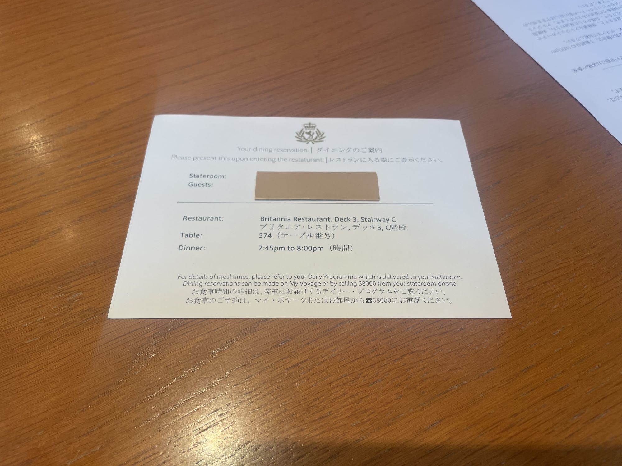 キュナードでは、事前に予約した場合、ダイニングのリザベーション・カードを、きちんと名前入りで印刷され、初日に客室に用意してくれます。