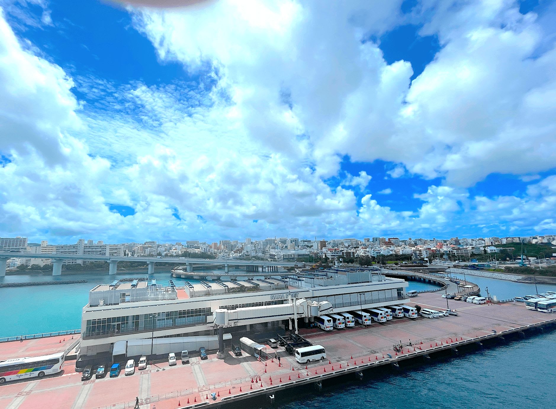 このターミナルは、那覇市の景色を一望できるロケーションに位置しており、市内中心部からは車で約15分、那覇空港からも車で約10分ほどで、タクシーやバスで容易にアクセスできますので、那覇から出発するクルーズに乗船する際にも非常に利便性の高い場所にあります。