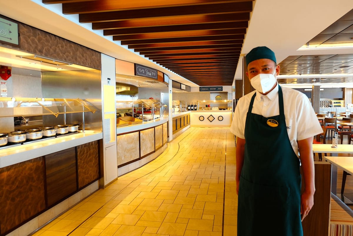 素敵な笑顔で我々をブッフェで迎えてくれるクルー