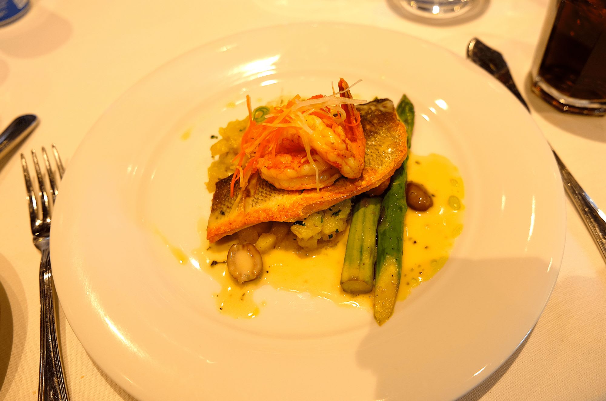 メイン:鯛と海老のグリル、オリーブ、アスパラガス、ハーブのソースのデュエット