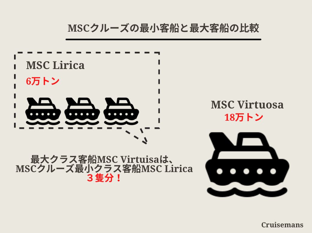 MSCクルーズの最大級客船で最新客船のMSCビルトゥオーサ(メラビリアクラス)は、最小客船のMSCリリカ(リリカクラス)3隻分もの大きさであるということになります!※総トン数で比較