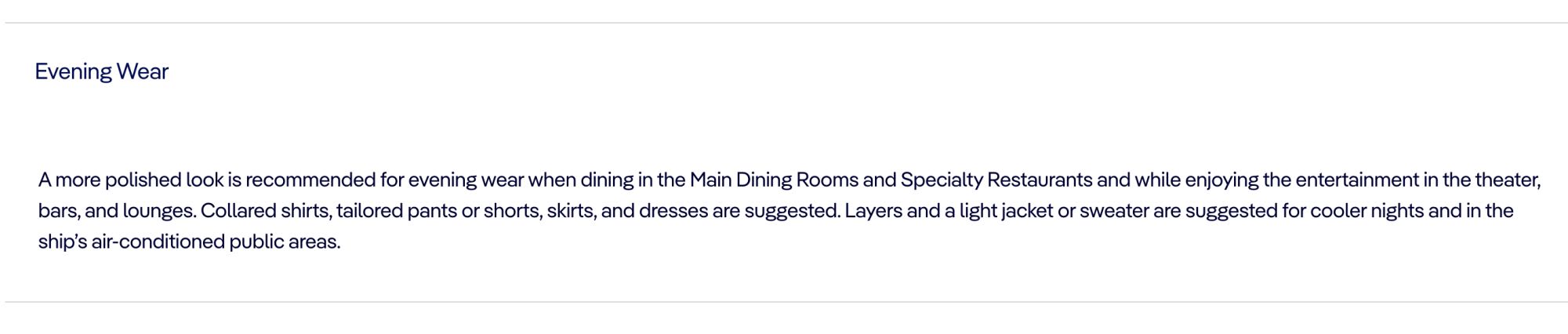 メインダイニングやスペシャリティレストランでの食事、また劇場やバー、ラウンジでのエンターテインメントを楽しむ際には、より洗練された服装をおすすめします。襟付きシャツ、仕立ての良いパンツやショートパンツ、スカート、ドレスなどが適しています。夜が涼しい場合や船内の空調が効いた公共エリアでは、重ね着や軽いジャケット、セーターなどもおすすめです。