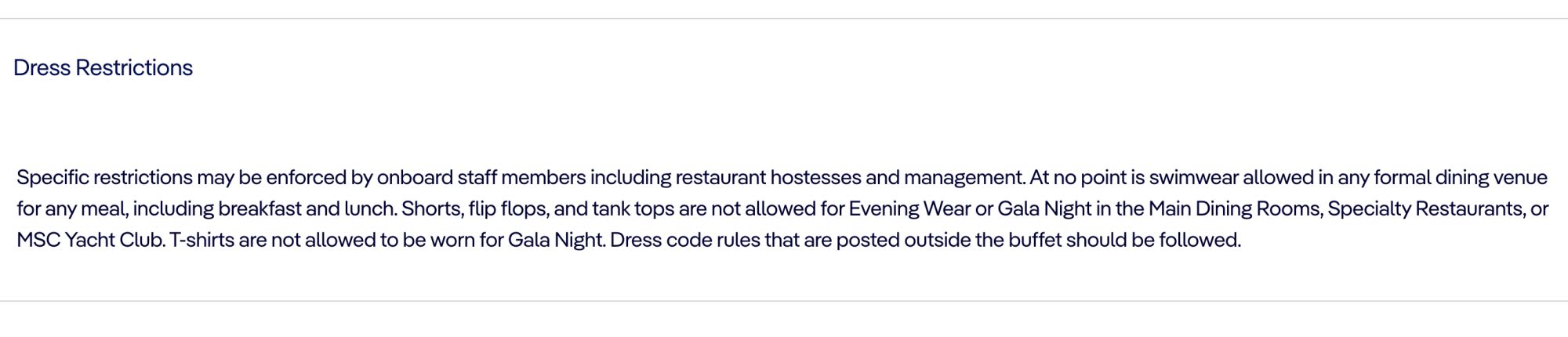 船内のスタッフやレストランのホステス、管理者によって、特定の服装制限が適用される場合があります。水着は、朝食やランチを含むいかなる正式なダイニング会場でも許可されていません。メインダイニング、スペシャリティレストラン、MSCヨットクラブでは、ショートパンツ、ビーチサンダル、タンクトップは、夜の服装やガラナイトの際には許可されていません。また、ガラナイトではTシャツの着用も禁止されています。ビュッフェの外に掲示されている服装規定に従う必要があります。