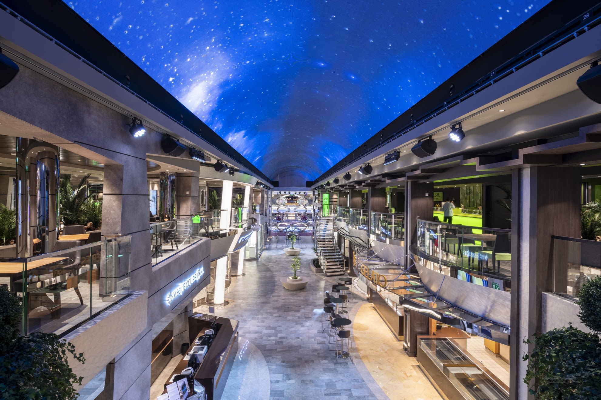 船の中心部に位置する「ガレリア・ベリッシマ」のLEDデジタルスクリーンに驚き。長さ80mのカーブ形状のデジタルスクリーンが、アーケードの屋根のように天井に設置され、24時間さまざまな映像を映し出します。