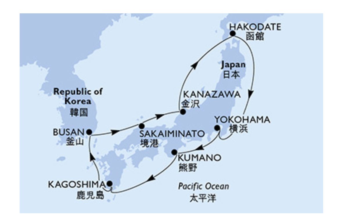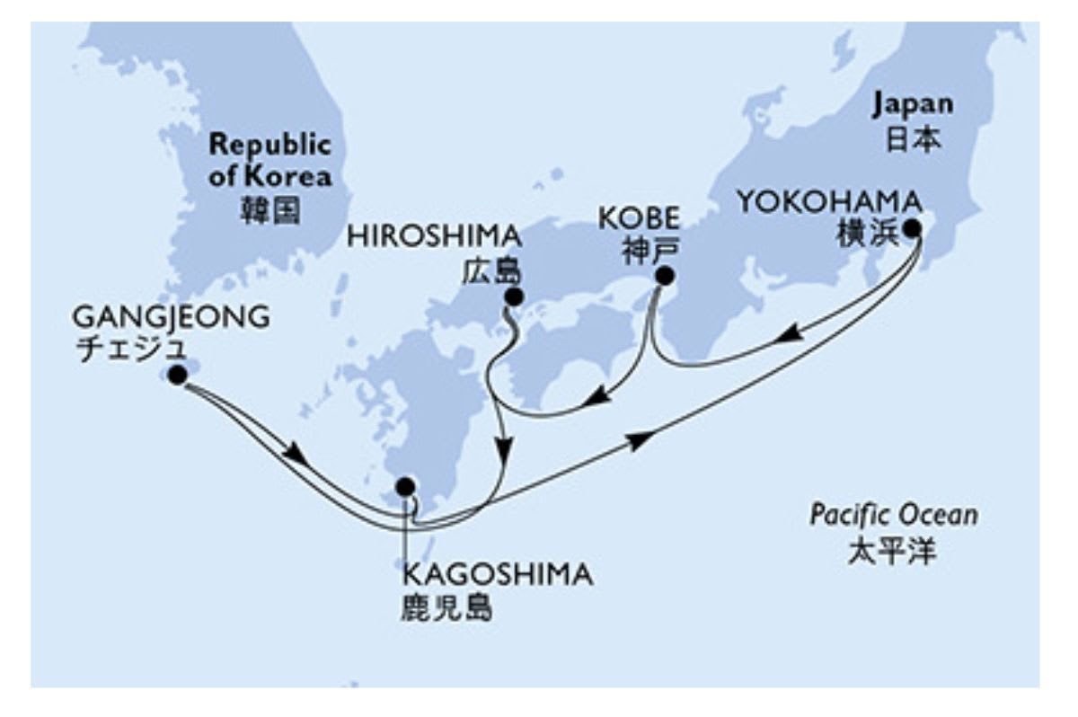 - 出発地:横浜発 / 横浜着 寄港地:済州(韓国)、熊本(日本)