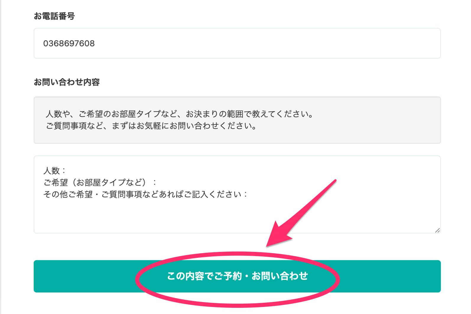 4.「この内容でご予約・お問い合わせ」をクリック