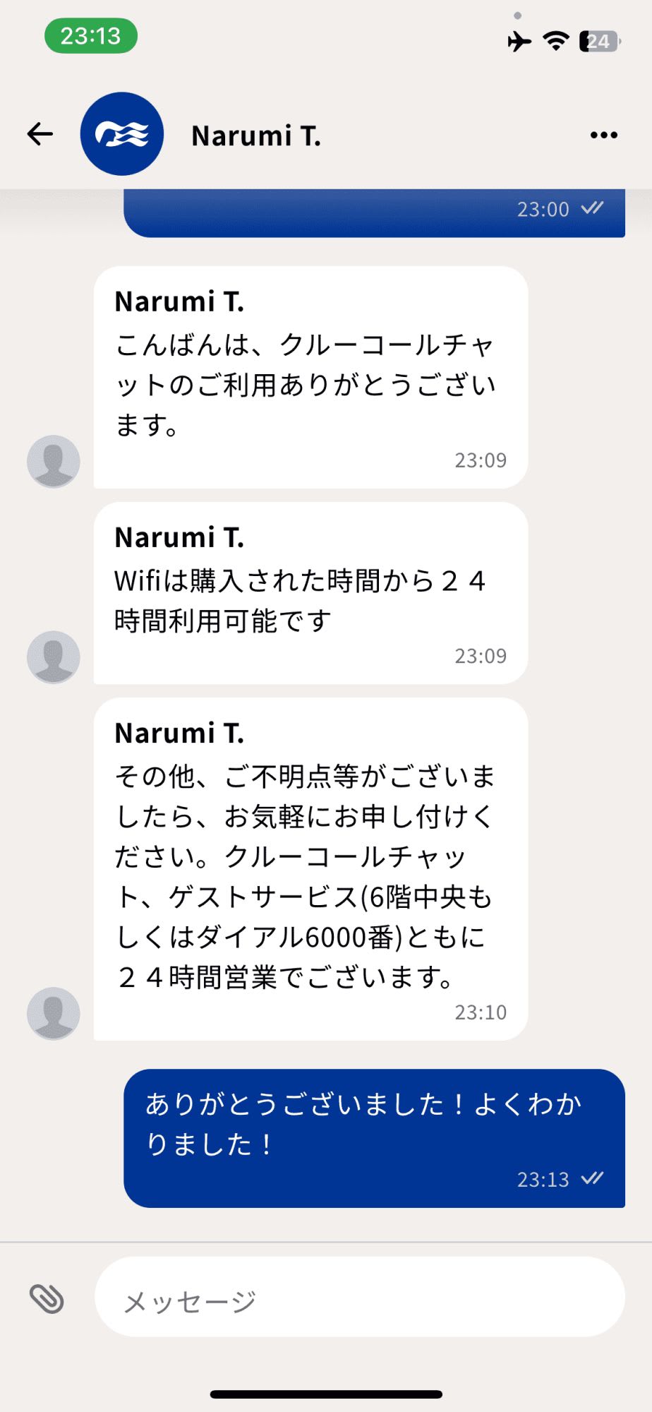 この船のサイズで本当に返答なんてくるのかな?と疑いの念を抱きつつ、Wi-Fiに関する質問をしてみたところ、なんとすぐに返答が返ってきて・・・とてつもない驚きを感じました。