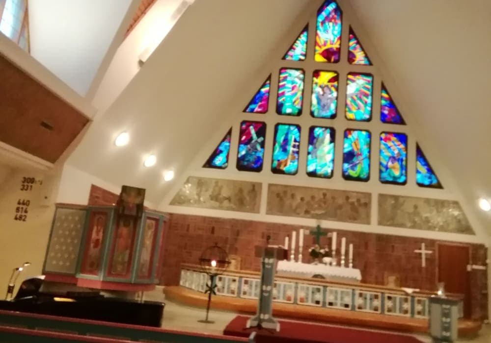 やっとオーロラに巡り合えた街。上陸して港の前を横切る大通りを右折して緩やかな坂道を上ると小さな三角屋根のモダンな教会にたどり着く。振り返って見上げた稜線の上に青白く輝く雲のようなものが見えた。最初は町の明かりで雲が照らされたのかと思ったが時間は朝の8時、北のはずれの小さな町の向こうに人家があるはずもなくオーロラと確信してシャッターを押した。オーロラに巡り合った唯一のチャンスだったのに、三脚を持たず慌ててシャッタを押したのが残念。