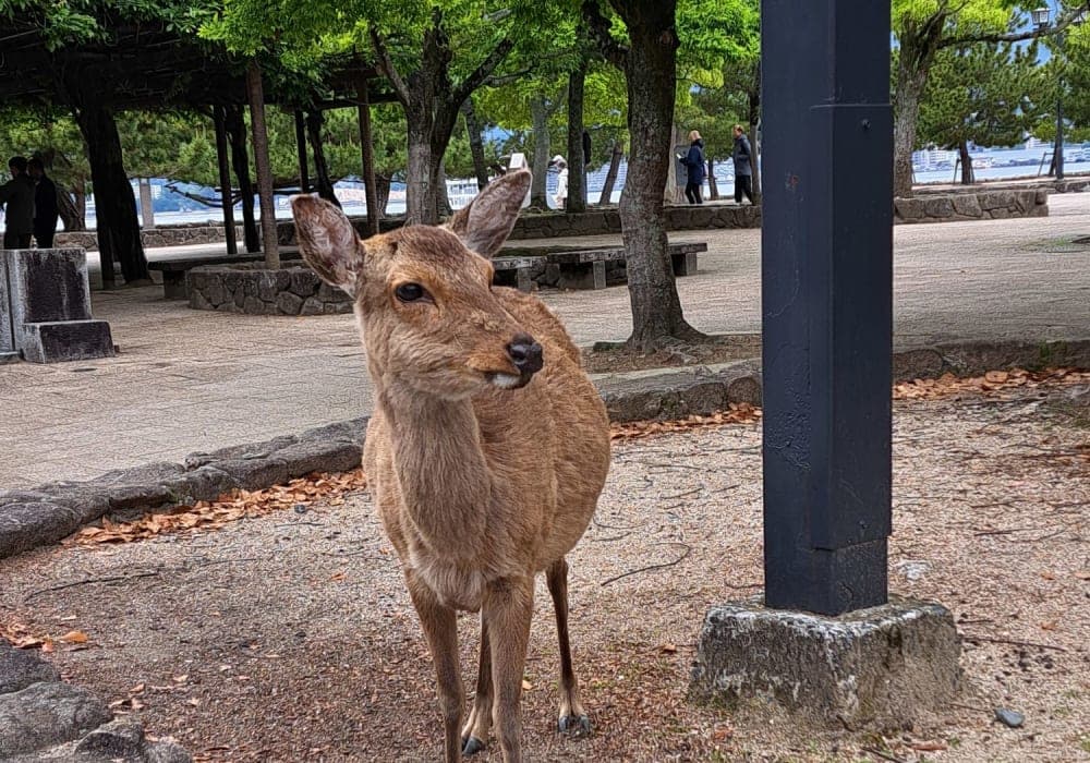無料シャトルバス(10分)で到着した五日市駅からJRとフェリーを乗り継いで宮島まで行きました。 有名な赤い大鳥居は工事中のため残念ながら2020年まで白い囲いに覆われています。 大元公園では、鹿がそこら中でのんびりしていて、小鹿もたくさんいました。ほとんど人がいなくて静かで落ち着いたよいところでした。 厳島神社を出たところの山代屋さんで焼きガキを食べましたが、ものすごく旨い!しかも安い!2個400円!名物のあなご飯も美味しかったです。 参道?はお店がたくさんあり、店内でお茶をいただきながら「揚げもみじ」(もみじまんじゅうの揚げたて)を休憩がてら頂きました。 ロープウエー乗り場までがけっこう登りがきつくて大変です。のんびりしすぎて頂上行きは断念してロープウェイ乗り場で折り返して帰ってたのが残念でした。