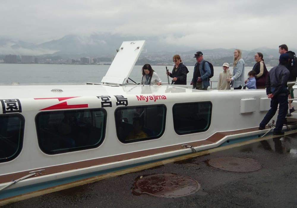 以前は五日市埠頭だったのですが、今回は宇品にあるクルーズターミナルに着岸。 船からフェリーが運航する徒歩15分のクルーズターミナルまで無料のシャトルバスが運行されていました。 広島駅や平和公園に行くのなら、そこから広電で行くのも良いのですが、宮島口まで行くとなると時間がかかってたいへんです! 午後から雨という予報だったので、我が家は下船してすぐにタクシーで広島駅に向かい(約2400円)JR山陰本線で宮島口まで行きました。10時30分には宮島に上陸できました。 帰りは、宮島から平和公園へ直接船で戻れる「世界遺産航路」を予約しました。 初めての広島に大満足でした。宮島と平和公園の両方に行きたい方におススメです。(逆の行き方もありです)