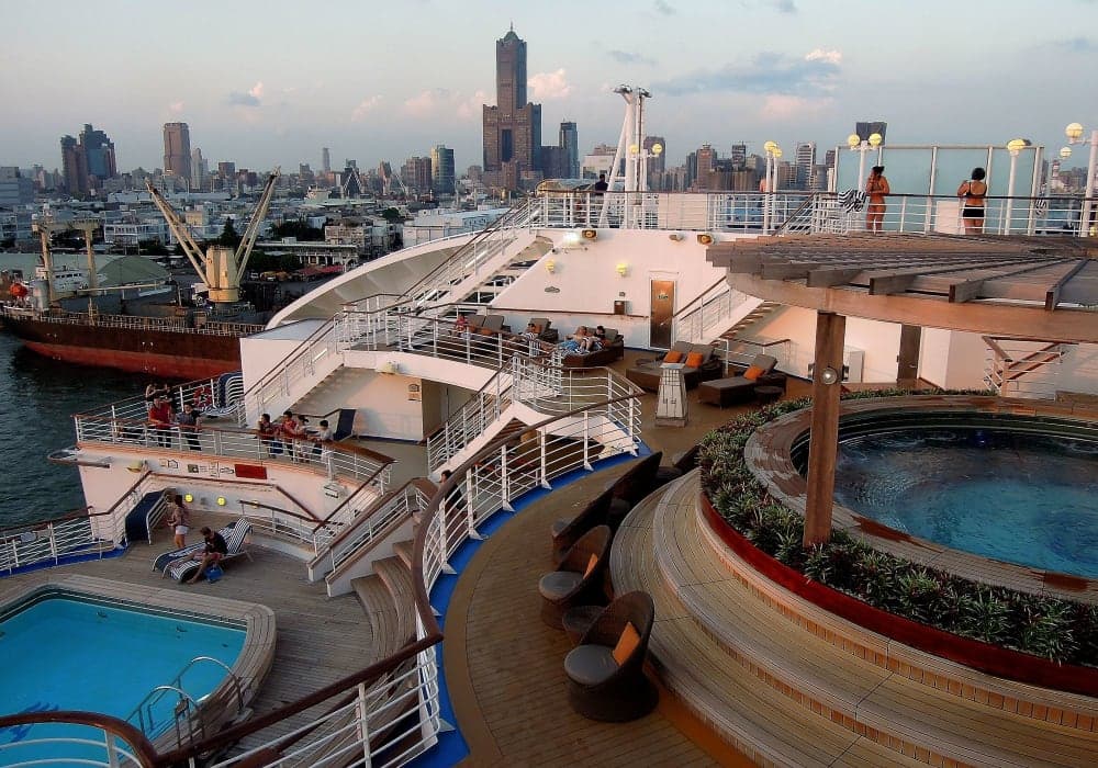38年ぶりに訪れた高雄は高層ビルが立ち並ぶ近代的な都市に変容し、西は台湾海峡、南はバシー海峡に面し、地理的にも重要な港であるだけに軍艦やコンテナ船が多数停泊しており、デッキから高雄港の景観を満喫しました。高雄ではオプショナルツアーで龍と虎の塔がシンボルの蓮池潭と旗津半島を観光。龍の口が入口で虎の口が出口の龍虎塔と春秋閣が有名な蓮池潭を見物。その後フェリーに乗って旗津に渡り、市場を見物。地元の人しか行かないような海鮮料理の食堂が目にとまり、そこで昼食を食べました。バイクに乗った乗客を一杯乗せた渡し船のような小さなフェリーでしたが、高雄港に停泊するダイヤモンド・プリンセスを船上から眺めながら潮風に吹かれて心地よいショートクルーズを楽しみました。