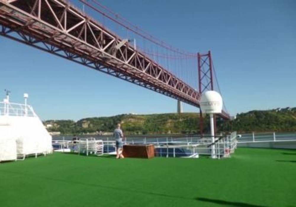 朝日を浴びながらリスボン港の入口という4月25日橋を潜ってリスボン港に入って驚きました。 河口と聞いていたのに対岸が遠くてここは湾じゃないのかと思いました。 船が着岸したのは大聖堂のあるアルファマ地区の下で旧市街まで直ぐの場所、予約の際にエクスカーションを取るかどうかリスボン港の地図を見ながら悩んだ身としては大正解です。 船を降りて10分も歩くと大聖堂の脇に出たのでそのまま坂を上がって行くと教会脇の展望の良いところに着きました。 そこでしばらく市街地を眺めた後、路面電車に乗ってリスボンの中心部に行き、天正遣欧使節団が来たというサン・ロッケ教会を見学、そこから歩きに歩いてサン・ジョルジョ城まで行きました。 ここまで歩くとさすがに疲れ切り、素晴しい景色を眺めるのもそこそこに早く船に戻ろうと坂道を降りていくと発掘現場に遭遇。 案内板を見ると紀元1世紀頃にローマ帝国が造った円形劇場の一部と書いてあってビックリしました。 船は夕方にリスボン港を出港、日が沈んでしだいに薄暗くなる中、私は部屋のバルコニーから大航海時代を記念するモニュメントであるベレンの塔を眺めていました。