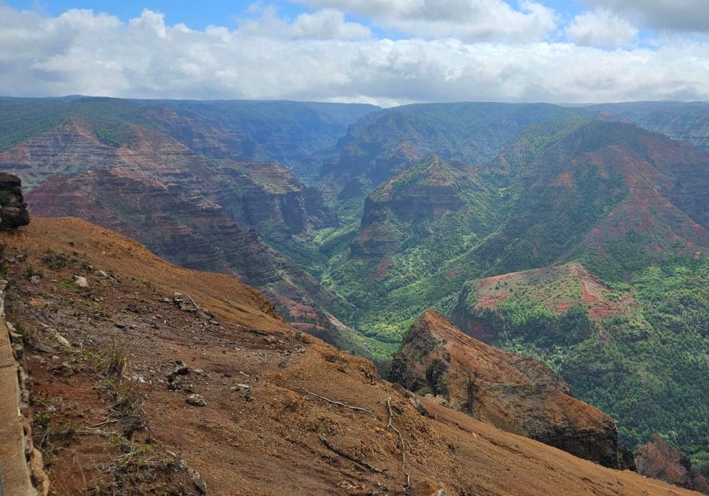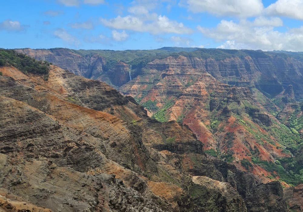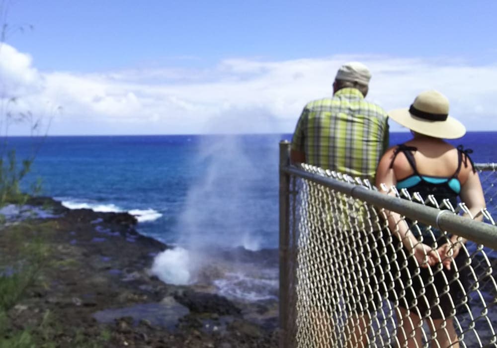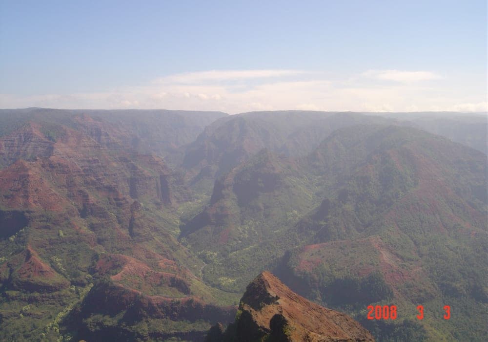 ワイメアキャニオンを観光。途中潮吹き穴を見ました。朝まで雨が降っていたのですが、到着時はきれいに晴れ、多彩な色の崖、遠くの滝も見ることができました。