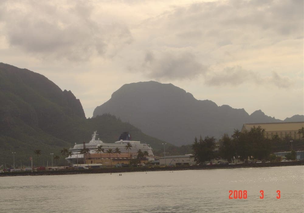 カウアイ島では2日間の休日を過ごし、カウアイ島では6つのオプショナルツアーが用意されていました。 ①キャプテンクックがハワイ諸島中で初めて上陸したというワイメアの街及び,ワイメア峡谷,カララウ展望台。シェラトンカウアイで昼食(6時間) ②シダの洞窟とワイルア川(3時間) ③ワイルア川とハナレイ海岸(5時間半) ④カクテルパーティと伝統的なハワイ科理ルアウの賞味(2時間半) ⑤ヘリコプターツアーワイアレア噴火口とワイメア峡谷とハナレイ海岸を空から探訪(1時間) ⑥ハナレイ・ルマハイ海岸,ハナエ洞窟(6時間) 我々は②コースで有名なシダの洞窟を訪れる事にしました。ワイルア川の河口から観光船に乗ってシダの洞窟へ。周囲の景色と雰囲気は何となく瀞八丁に似ている感じ。船の中では,ウクレレを中心にハワイアンを歌ってくれました。桟橋より5分程歩くとヒンヤリとした洞窟へたどり着く。ここがかの有名なシダの洞窟(Fern Grotto)。ここで原住民の王が結婚式をあげた場所と言われ、それにあやかりハワイアンウェディングソングを聞かしてくれました。周囲が岩の為か歌声が洞窟内に響きわたり、その余韻は素晴らしかった。 ナウィウィリ港は軍港の為、進入禁止地域があったり、護衛艦が沖で錨を降ろしている為インディペンデンス号だけの撮影を満足に撮る事が出来ませんでした。