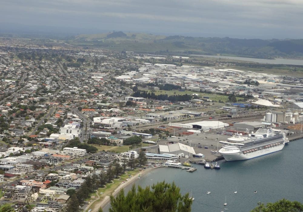 海が荒れて抜港となったが、最終寄港のベイオブアイランドが悪天候のため取り止めとなり、船長の配慮でタウランガ入港が復活するという珍しいケースを初体験。 マウンガヌイ山(標高232m)に1時間かけて登り、クラウン・プリンセスを俯瞰的に眺められ、周囲の風光明媚な風景も満喫できた。 さらに歩いてタウランガの街を散策できた。