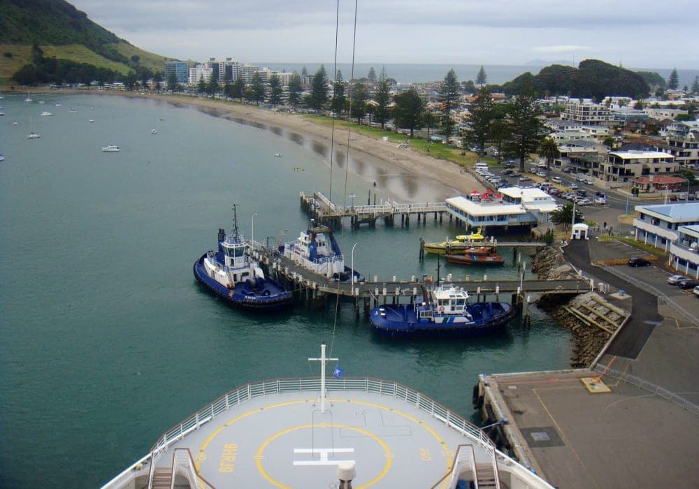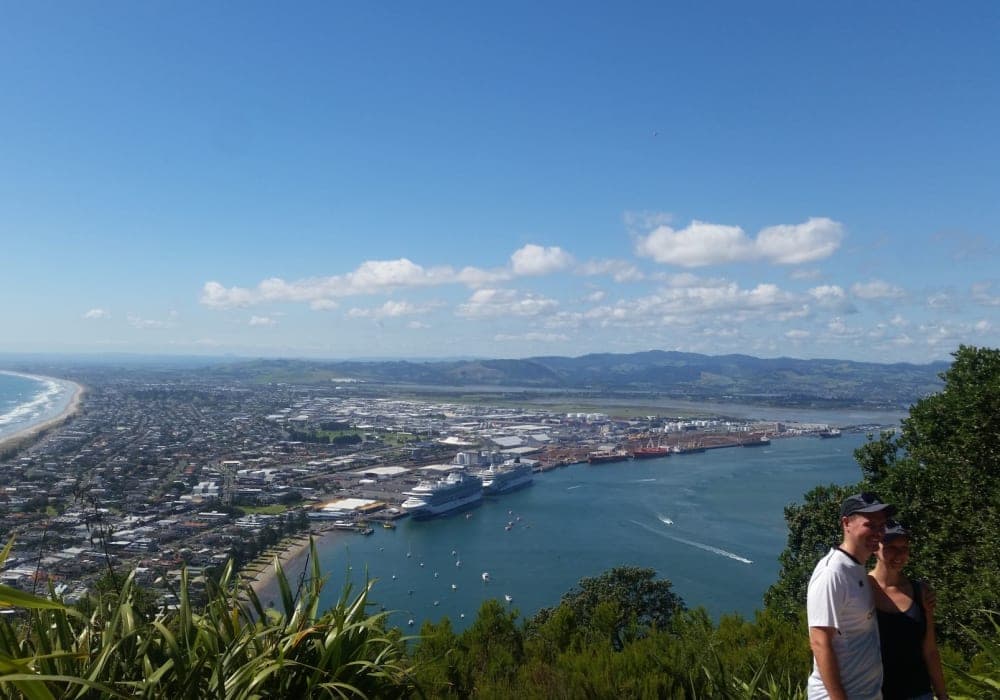 港から街の中心部までは市バスが走っていますが、大きなショッピングモールで買い物をしたいのでなければ行かなくてもいいです。ロトルアへのツアーが主な観光です。港の出口のところでローカルのツアーが色々出ているので、船のツアーよりも安く観光できると思います。 私たちはロトルアへ行かず、港からすぐのマウントマンガヌイへ歩きに行きました。頂上まで登ると停泊している船が見下ろせます。