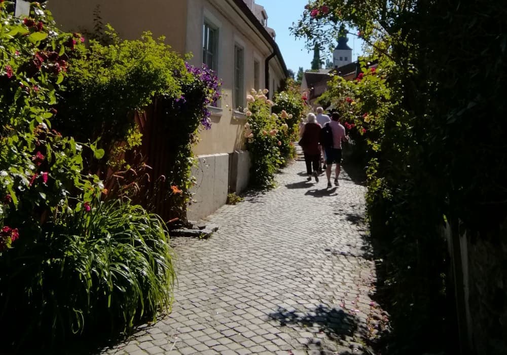 ヴィスビーはは本当に素敵な寄港地でした。アルメダール公園までシャトルバスを利用し、ここも歩いての観光です。港には、ロイアルカルビアンが先に入港していました。 私たちは、港に平行に入港しているクルーズ船を見たのは初めてでした。 ヴィスビーは遺跡や廃墟、どこを見てもおとぎの国のようで、感激しました。ずっとここに住みたいね!と話したくらいです。 ガイドブック通りに火薬塔・漁師の小路・サンタマリア聖堂など等、歩きました。 サンタマリア聖堂の横の階段を上がると、市街が一望できます。 日本と時期が同じようなのか?アジサイやバラなど、日本で今の時期に咲いているような花が咲いていて、これにも感激でした。 民芸品や手作りのマーケットも多数出ていました。 ただ、レストランなどは人が多く入れませんでした。外で食べれなかったのが、心残りです。 私たちは暑かったのでシャトルバスを利用しましたが、港から歩くことも十分できます。 ほとんどの場所を観光しても5時間ぐらいで回れると思います。
