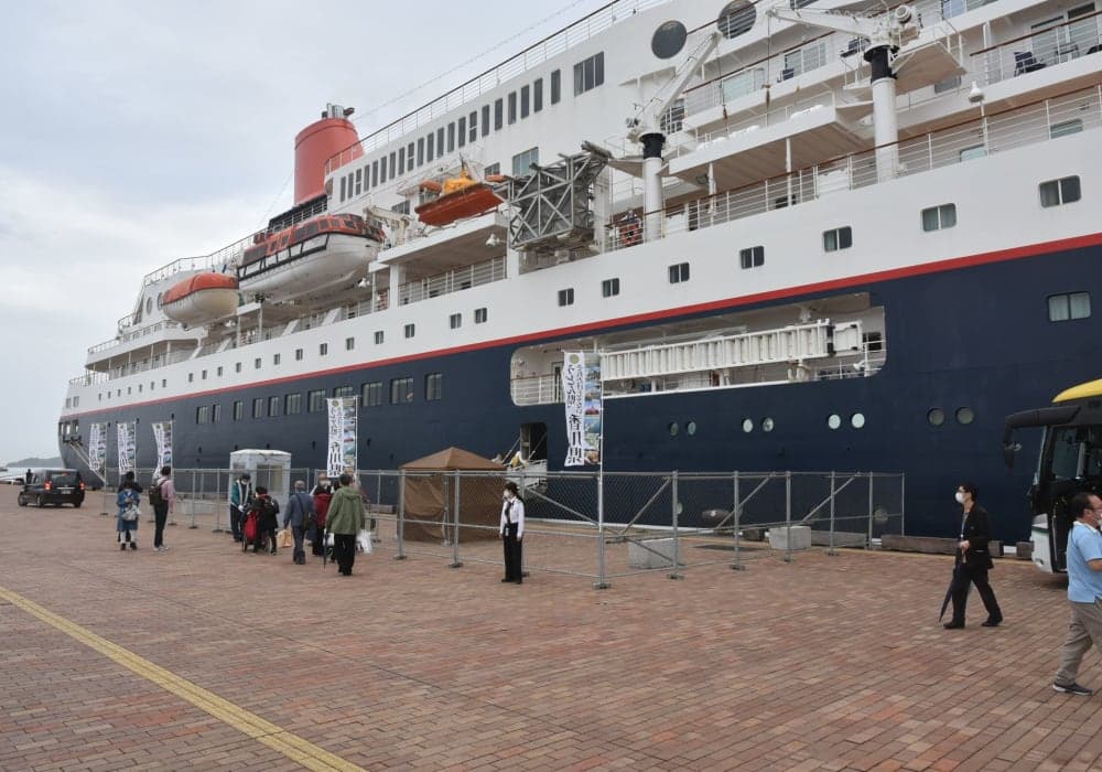 クルーズターミナルから市内へは徒歩で移動できましたが、とにかく猛暑だったため観光もままなりませんでした。 元々琴平参りをする予定でしたが、暑すぎて断念せざるを得なかったのが残念でした。 市内で讃岐うどんを食べて早々に船に戻りました。 各寄港地では、入港の儀式や歓迎の踊りやブラスバンド、巨大な書の披露などがあり、出航の際にも毎回出航セレモニーやテープ投げがありました。 飛鳥が地域の人々に愛されてると感じてとても嬉しく思いました。 高松では船上から花火大会を鑑賞しましたが、打ち上げ場所の真ん前に船が停泊していたのですごい迫力でした。花火の前の縁日も楽しく、子供もとても喜んでいました。