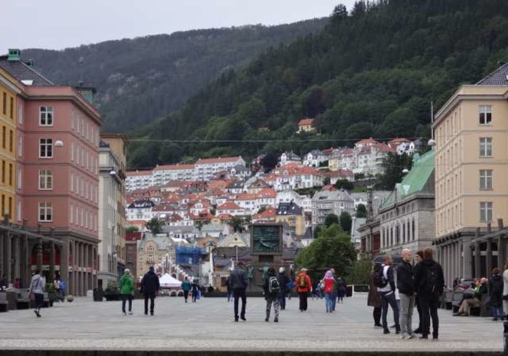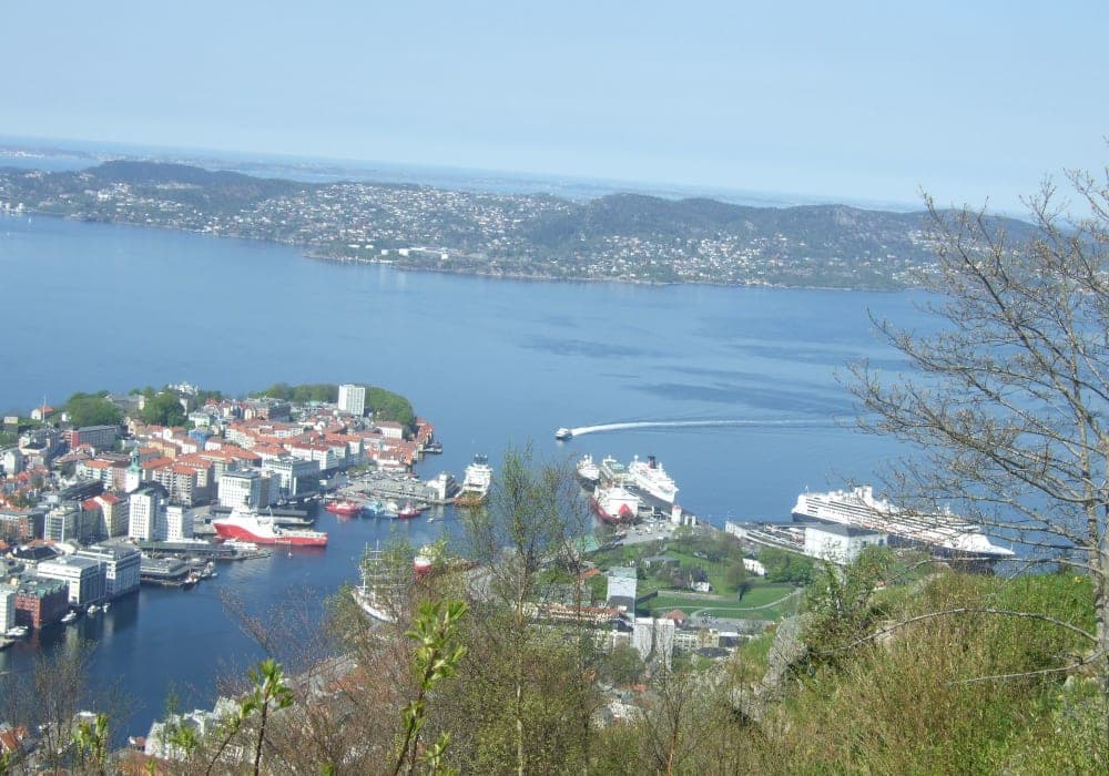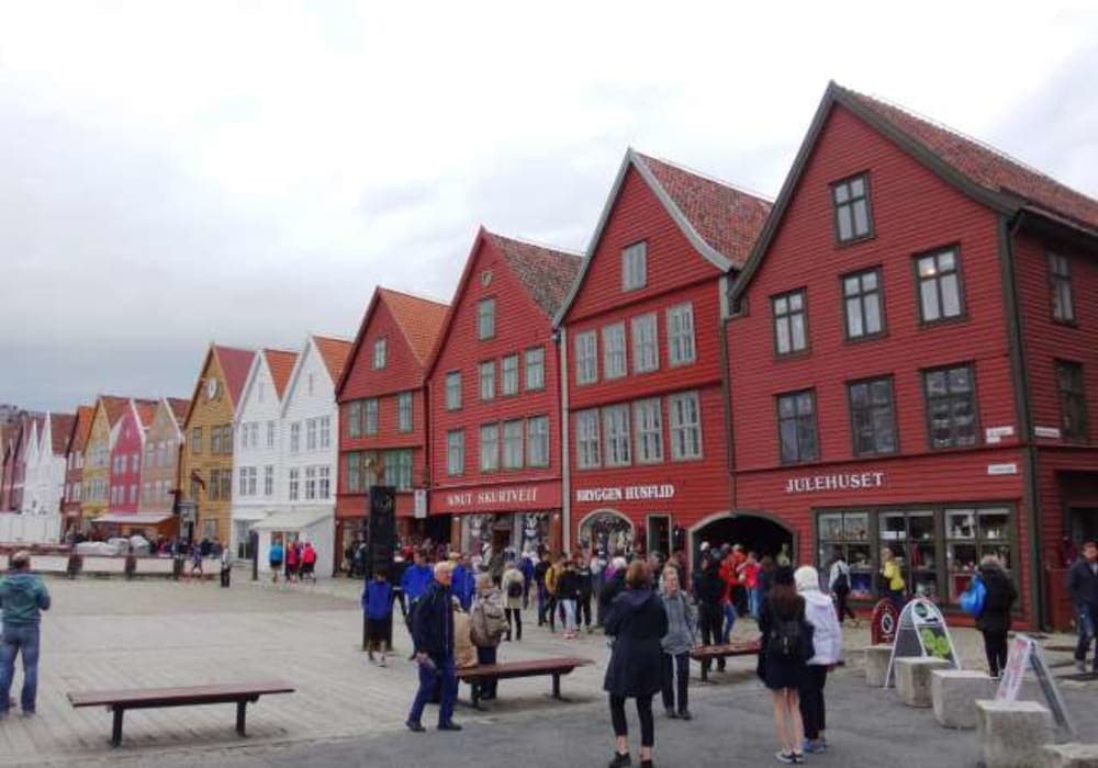 船が世界遺産ブリッゲン地区の木造家屋群がある側の桟橋に着いたので歩いて行きました。 観光の中心地は木造家屋群から500m四方程度なので徒歩で十分だと思います。 なお、展望台の有るフロイエン山へのケーブルカー乗り場もその範囲ですが、その日はクルーズ船が数隻ほぼ同時に着いており乗り場は長蛇の列。 私たちは乗車を諦めて徒歩で登りましたが、道中の景色は良いものの予想以上に遠いうえ坂道の傾斜もハードで参りました。