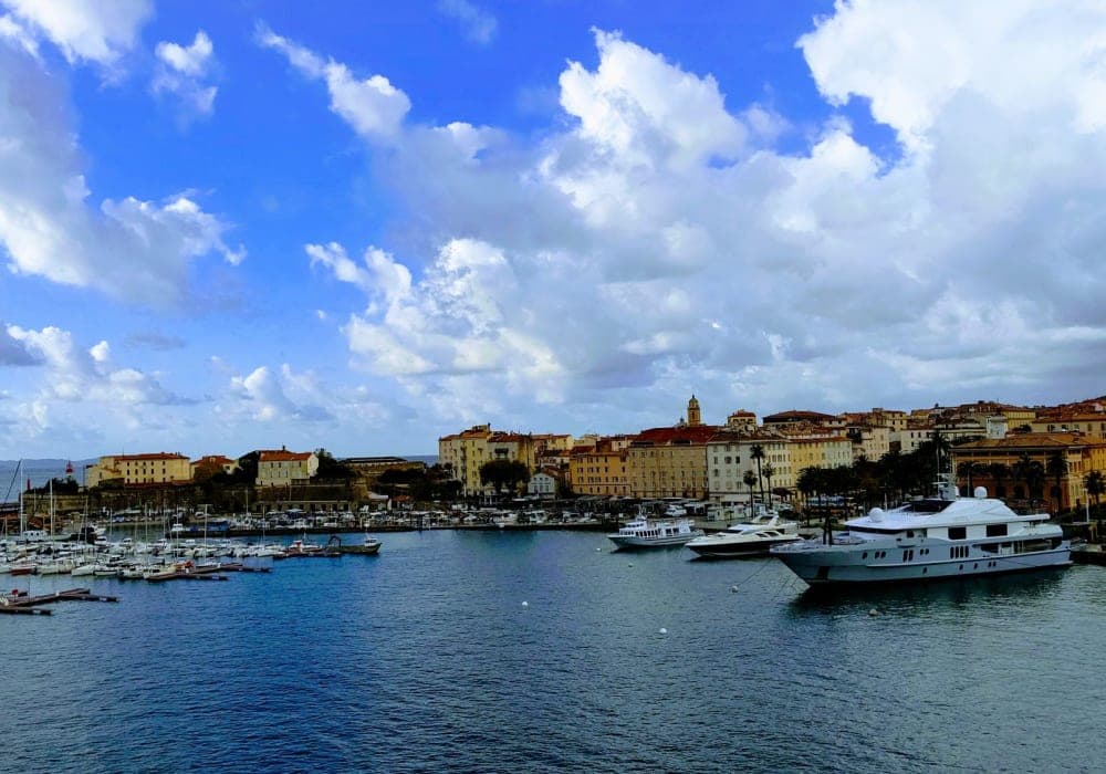 桟橋を出るとすぐ街。その街もとても小さく、徒歩半日で十分です。エクスカーションに参加して他にもいけば楽しさも倍増するのかもしれませんが、コルシカ島の雰囲気を感じ取るためには街歩きと、決め楽しく歩きました。レストランに入ったのですが、私たちの一人前でムール貝のワイン蒸しが終了。 看板メニューを逃しましたが、バケツのような鍋で来るムール貝より、こじんまりとした魚介類の前妻の方が良かったのかもしれません。