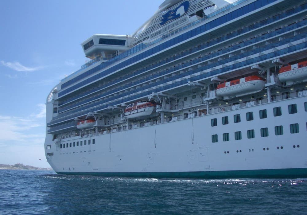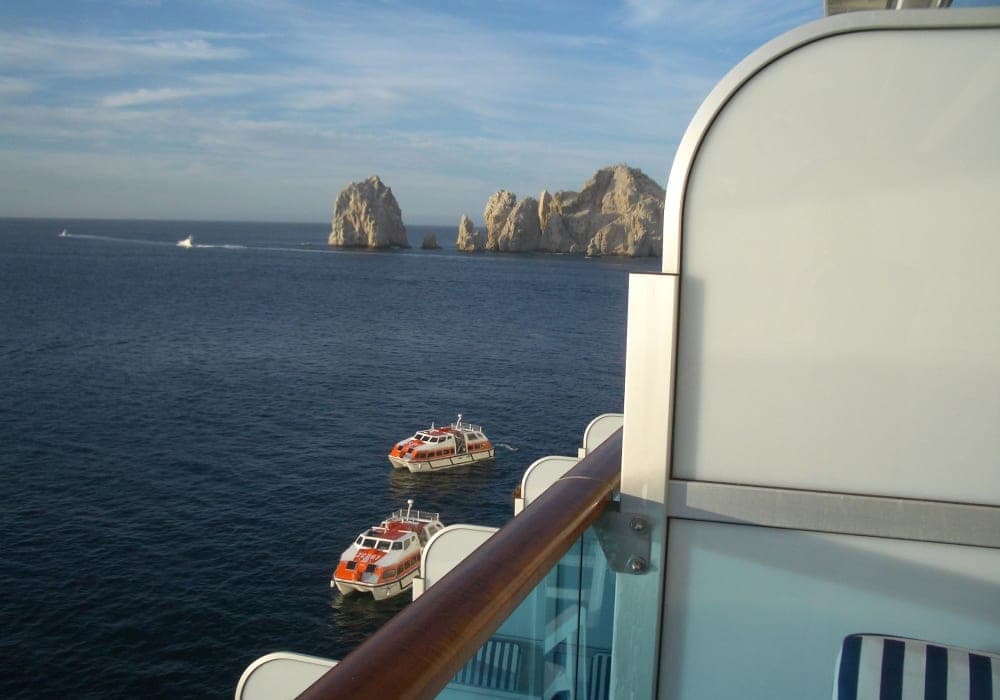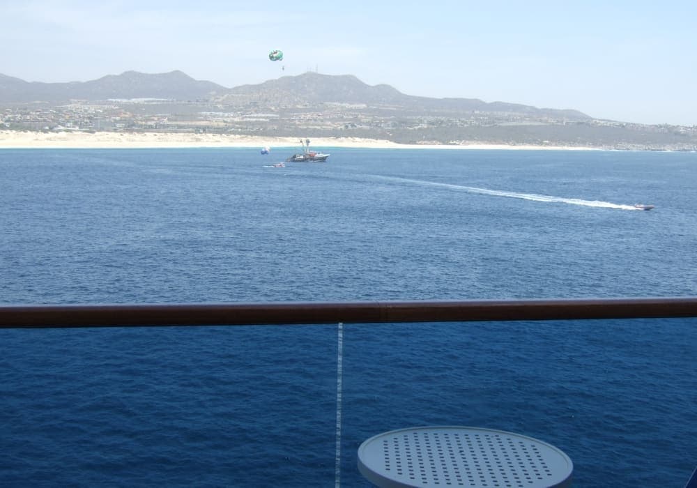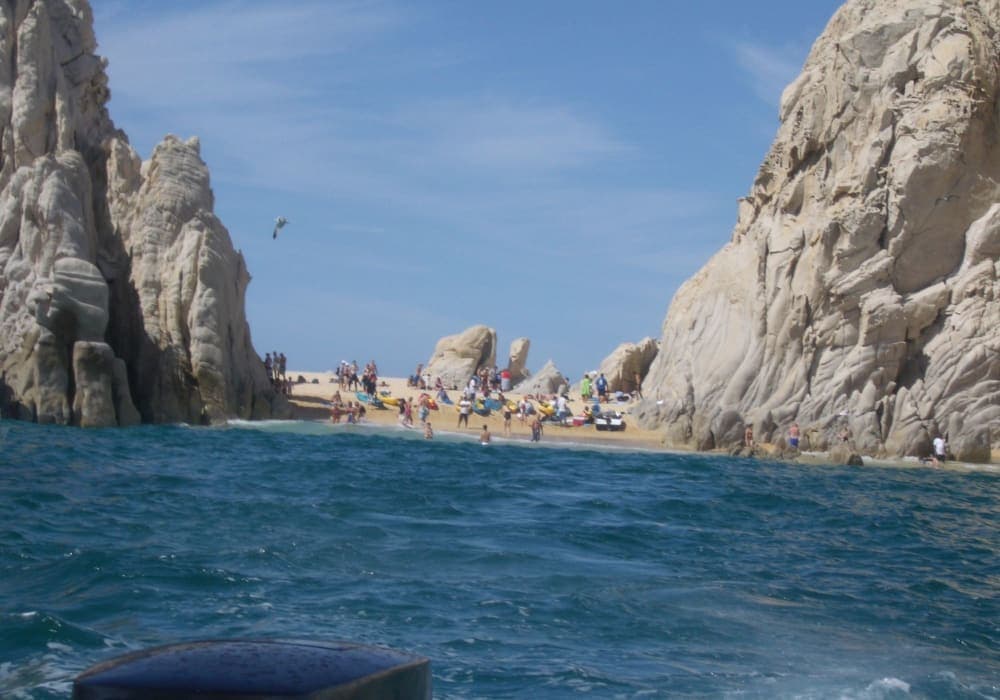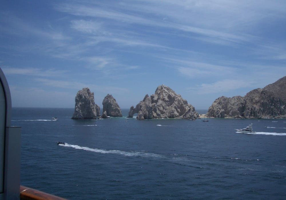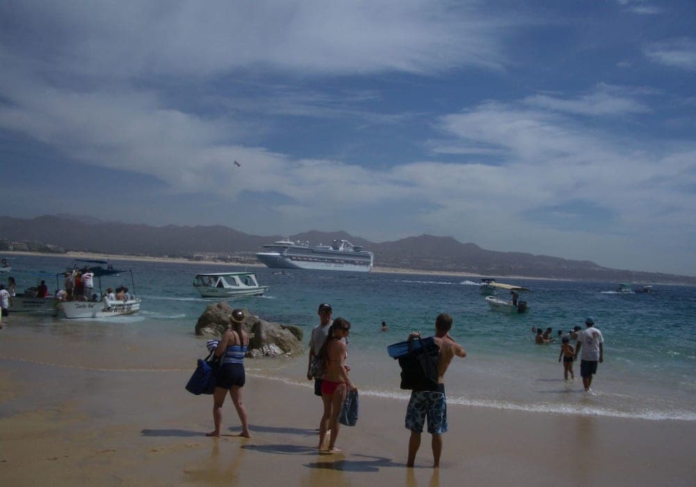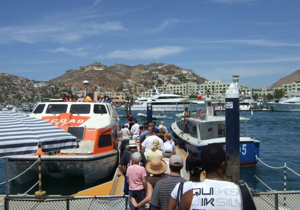 テンダーで上陸。周囲は緑のない乾燥した土色の丘が続く。港にはたくさんのヨットやクルーザーが係留されている。ここはカジキなどのスポーツフィッシングの基地でもあるリゾート。港周辺を散策の後、バハカリフォルニア半島最南端の小さなビーチまで船をチャーター。ビーチ手前の腰位の水深の場所で船を降り、浸食された岩に挟まれた小さな砂浜で暫く時間を過ごす。すぐ横の太平洋側は結構波が高いが、ビーチ側は穏やか。沖には停泊しているサファイアプリンセスが見える。明るいメキシカンリビエラの陽射しの中、心地よい海風を楽しんだ。 この後、カボサンルーカス出港後、サファイアプリンセスはエンジンが故障。スピードが上がらず結局、予定より約10時間遅れでロサンゼルス港に到着した。船内フロント前は、下船後の飛行機の変更やホテルの手配等の手続きをする多くの乗客で大混雑。幸い我々は当初から下船後ロスで一泊し、翌朝のフライトでシンシナチの友人宅へ向かう予定だったので全く影響を受けなかった。